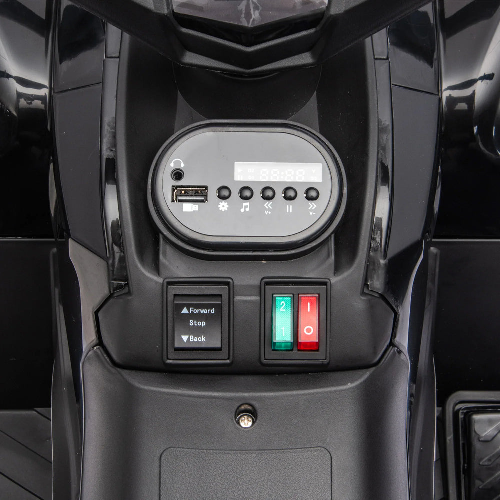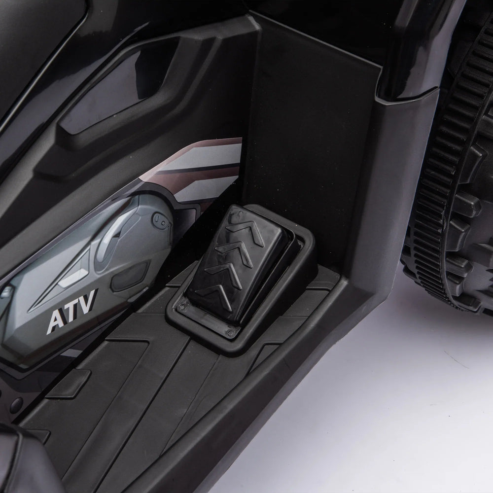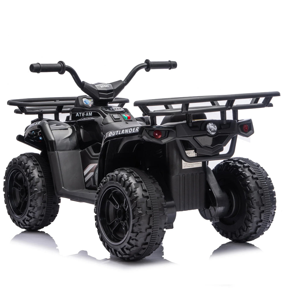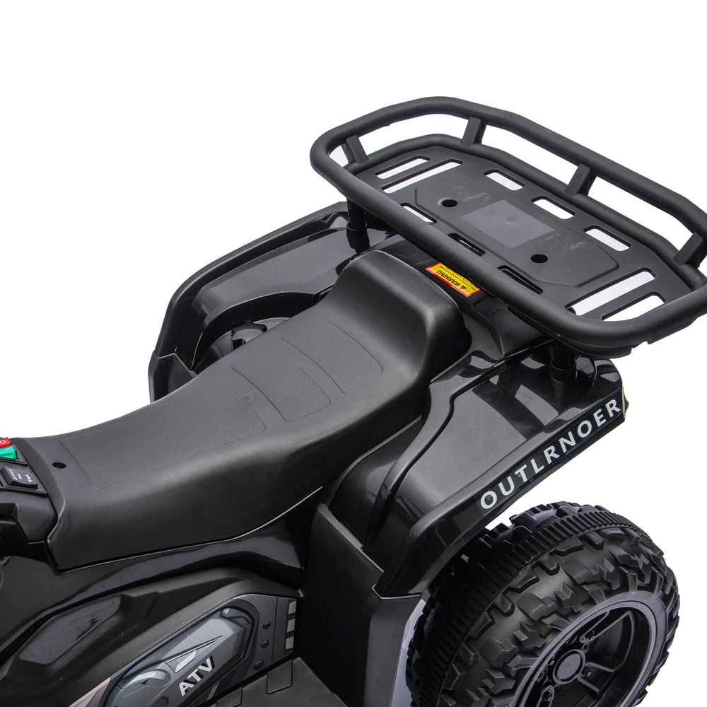 This black polypropylene kids ride-on ATV features a powerful 24V motor for smooth acceleration, durable crash bars, anti-slip tires, front and rear storage racks, LED headlights, Bluetooth, MP3 playback, and a battery level display, perfect for ages 3 to 5.