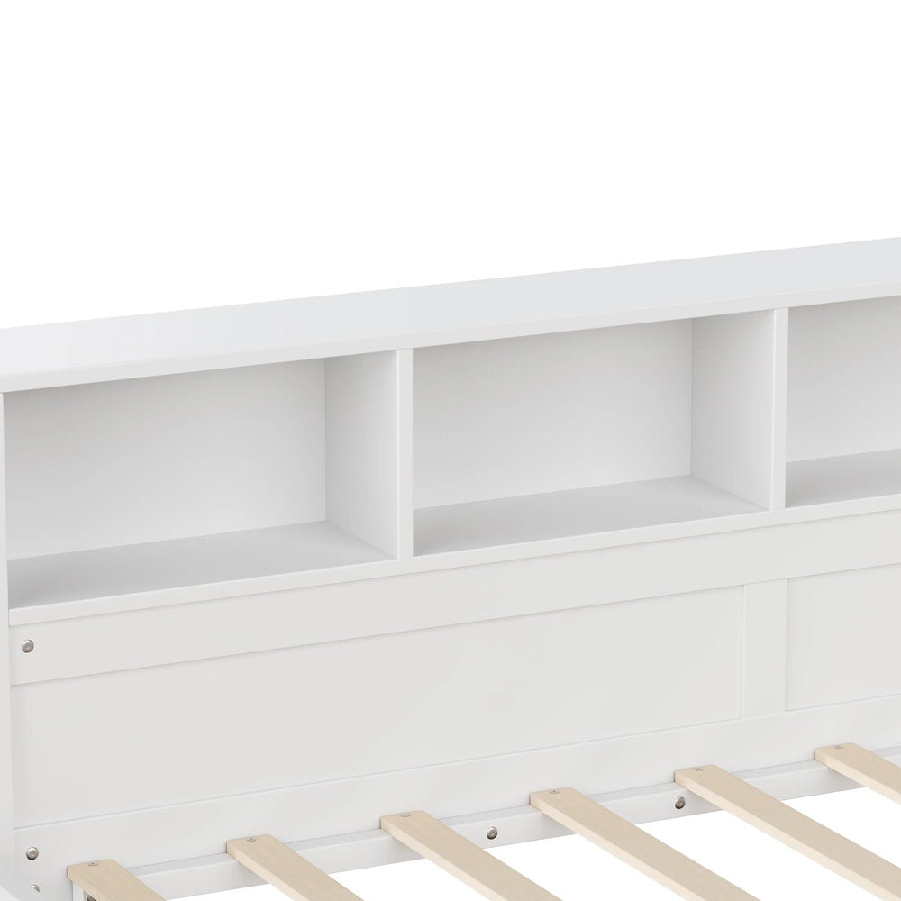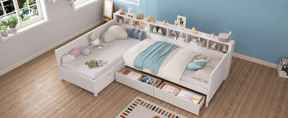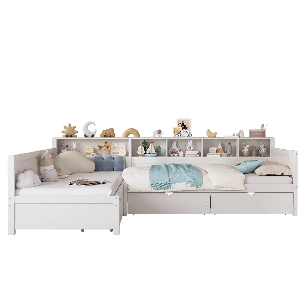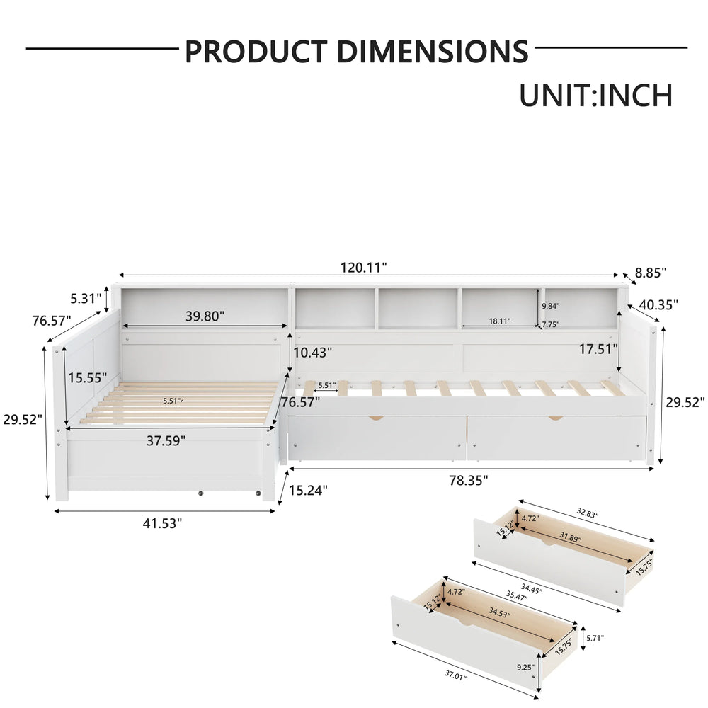 This versatile twin size day bed comfortably accommodates two sleepers with its dual twin beds, perfect for bedrooms or living rooms. Crafted from durable MDF, plywood, and pine wood, the L-shaped design efficiently utilizes corner spaces to keep your room open and inviting. Three large built-in drawers provide ample storage for bedding, clothing, or everyday items, while the integrated bookshelf offers flexible organization for books and décor. With a sturdy frame supporting up to 350 lbs per bed and 20 solid slats, this day bed delivers reliable comfort without the need for a box spring. Easy to assemble and finished in clean white, it’s an ideal solution for multifunctional spaces and smart living. Elevate your home’s comfort and organization today.