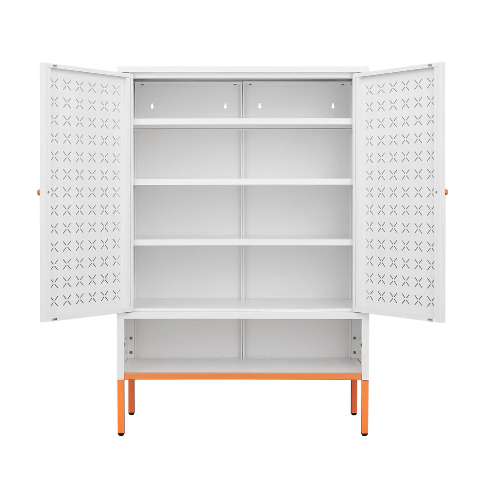 Modern white metal shoe cabinet features adjustable shelves and elevated base for moisture prevention and easy cleaning. Dual butterfly doors optimize space and ensure smooth access. Ideal for primary living spaces seeking organized, customizable footwear storage with a minimalist design.
