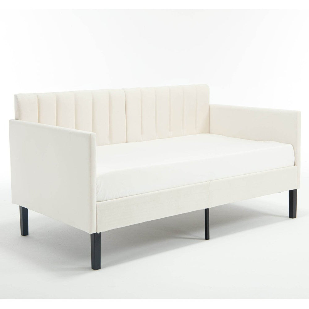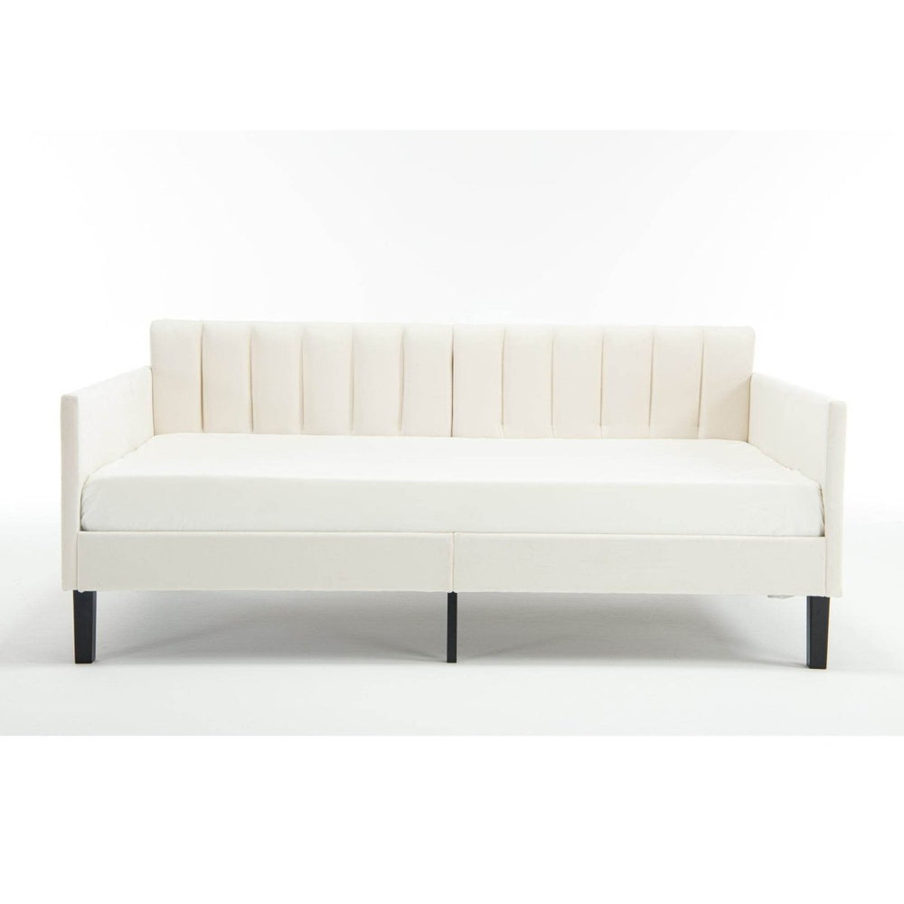 The Elena Daybed combines modern design with plush comfort, featuring an ivory velvet upholstery and a ribbed, tufted backrest that adds elegance to any bedroom or living space. Its high-density foam cushion delivers cozy support, making it perfect for lounging, reading, or overnight guests. Crafted with a sturdy metal frame and bentwood slats, this twin-size daybed supports mattresses without the need for a box spring. The powder-coated metal structure ensures durability and squeak-free use, supporting up to 400 pounds. Measuring 78.7 inches long by 43.5 inches wide and 33 inches high, the Elena balances form and function in one sleek package. Easy to assemble and shipped with all necessary tools, it’s ready to refresh your space. Elevate your home comfort and style today.
