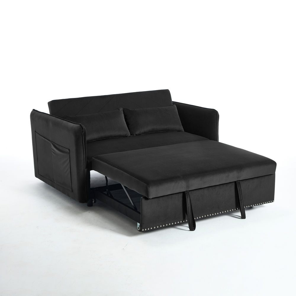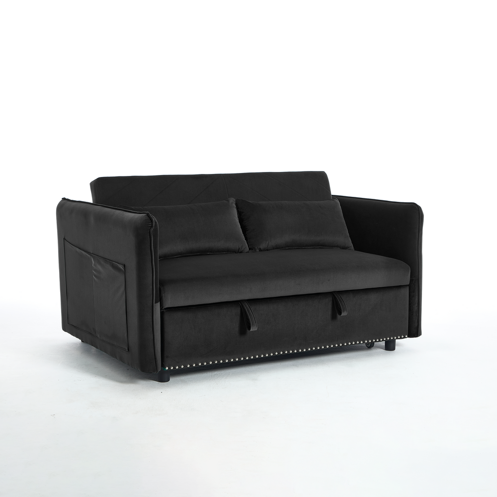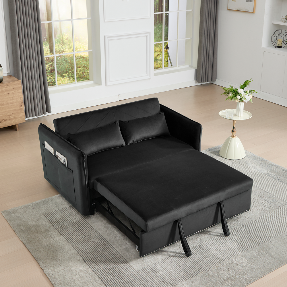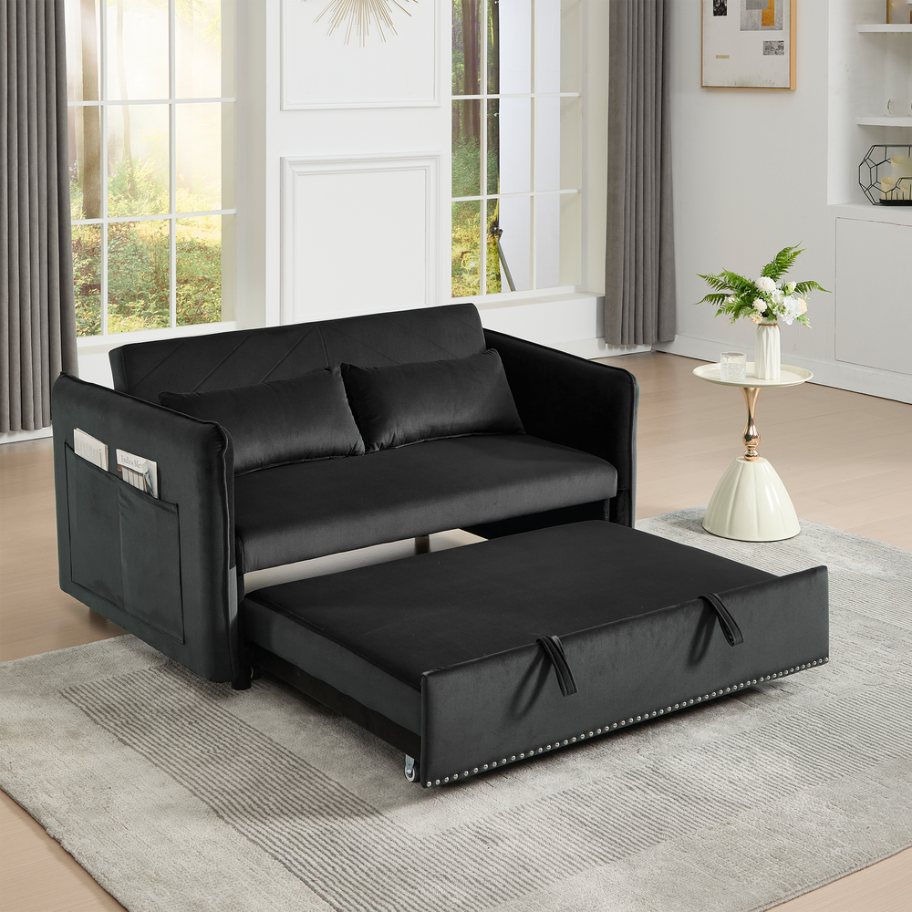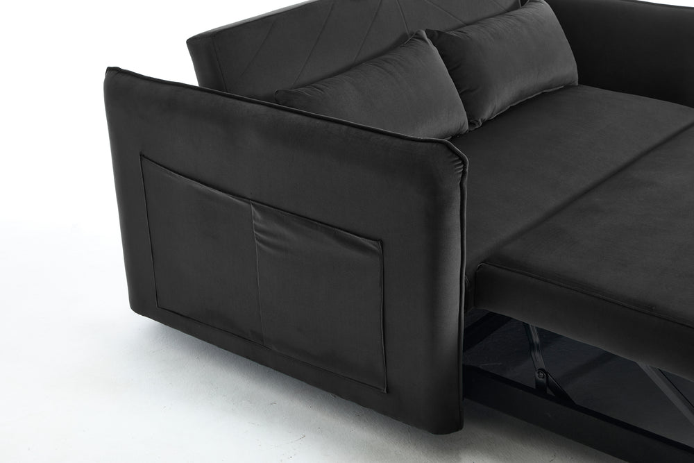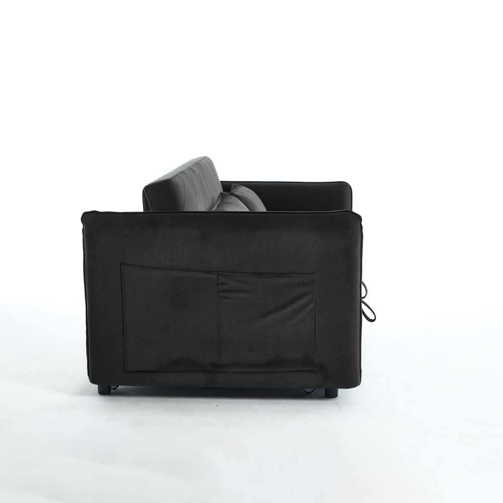 Maximize your living space without sacrificing style or comfort with this modern 3-in-1 convertible sleeper futon sofa bed. Upholstered in soft black velvet, it transforms effortlessly from a cozy loveseat to a reclining lounge or a convenient pull-out bed, making it ideal for small spaces and multi-functional rooms. The sturdy rubberwood frame paired with high-density foam and sinuous springs delivers lasting durability and plush medium-soft seating. Two supportive lumbar pillows enhance relaxation, while the removable side storage pockets keep your essentials close at hand. Perfect for primary living areas, this space-saving sofa adapts to your seating and sleeping needs with a smooth, easy-to-use adjustable backrest. Elevate your home comfort and organization today.