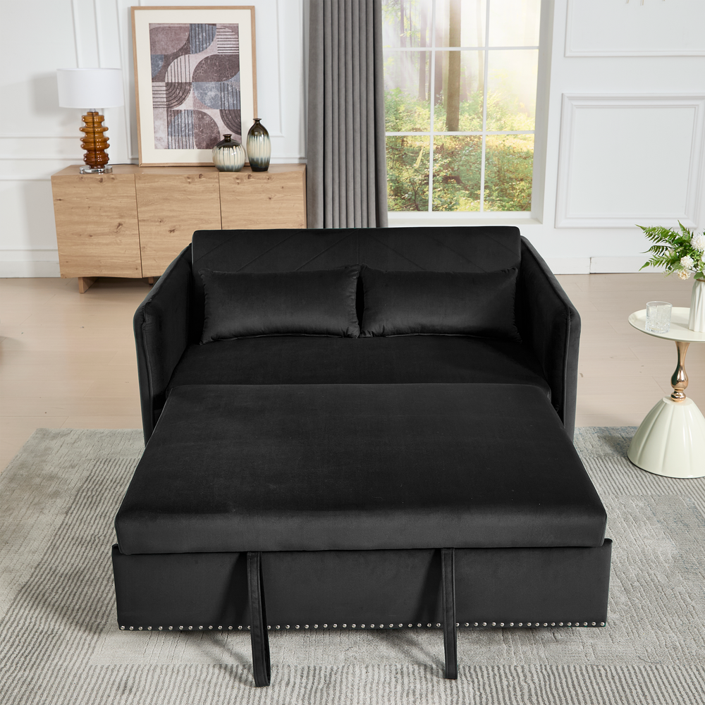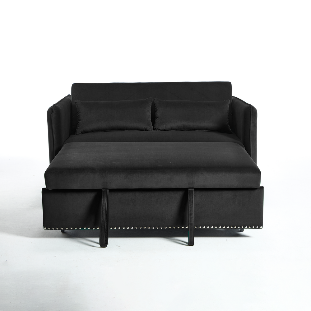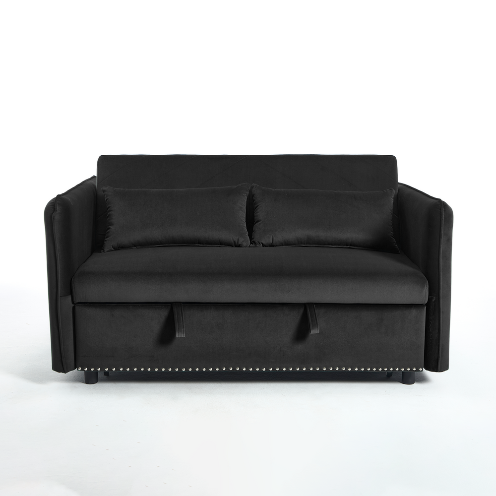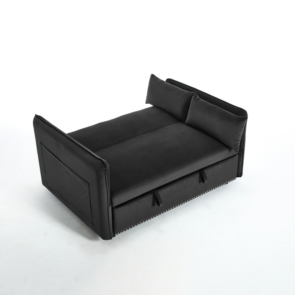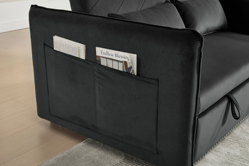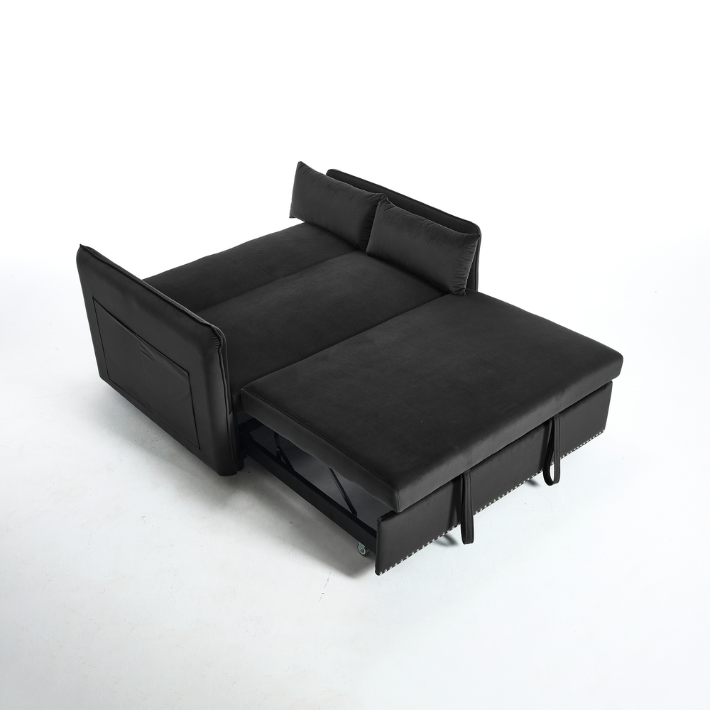 Maximize your living space without sacrificing style or comfort with this modern 3-in-1 convertible sleeper futon sofa bed. Upholstered in soft black velvet, it transforms effortlessly from a cozy loveseat to a reclining lounge or a convenient pull-out bed, making it ideal for small spaces and multi-functional rooms. The sturdy rubberwood frame paired with high-density foam and sinuous springs delivers lasting durability and plush medium-soft seating. Two supportive lumbar pillows enhance relaxation, while the removable side storage pockets keep your essentials close at hand. Perfect for primary living areas, this space-saving sofa adapts to your seating and sleeping needs with a smooth, easy-to-use adjustable backrest. Elevate your home comfort and organization today.
