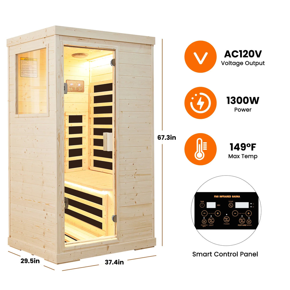 Step into soothing warmth with this compact far infrared sauna, perfectly designed for single-person use. Crafted from natural spruce wood, stainless steel, and glass, it offers a clean, modern look that blends seamlessly in any wellness space. Equipped with six spectrum heating plates, it delivers consistent infrared heat that penetrates deeply for improved circulation, detoxification, and muscle relaxation. The sauna operates quietly within a comfortable temperature range of 59°F to 140°F (15°C to 60°C), allowing you to customize your session. Warm-colored LED lights under the seat and around the roof create a calming, spa-like atmosphere. With a sturdy seat supporting up to 220 lbs (100 kg) and compact internal dimensions, it fits comfortably in small areas without sacrificing comfort. Elevate your home wellness routine today with this efficient and rejuvenating infrared sauna.