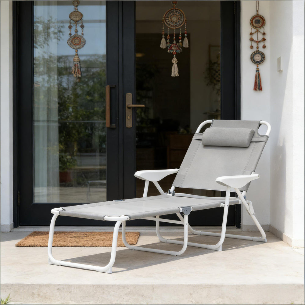 This light gray folding chaise lounge features breathable mesh fabric, adjustable backrest with four reclining positions, and cushioned armrests for relaxing sunbathing. Lightweight and foldable for easy transport, it supports up to 265 lbs and requires no assembly.