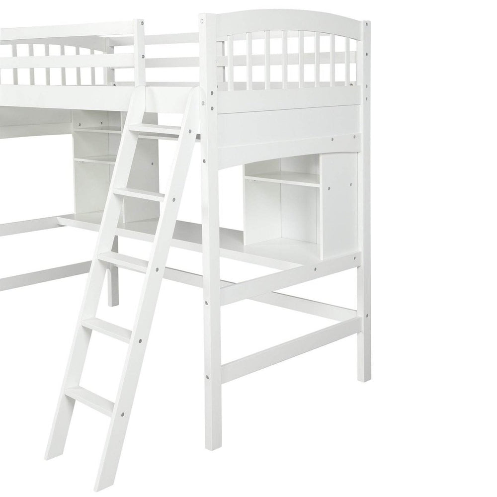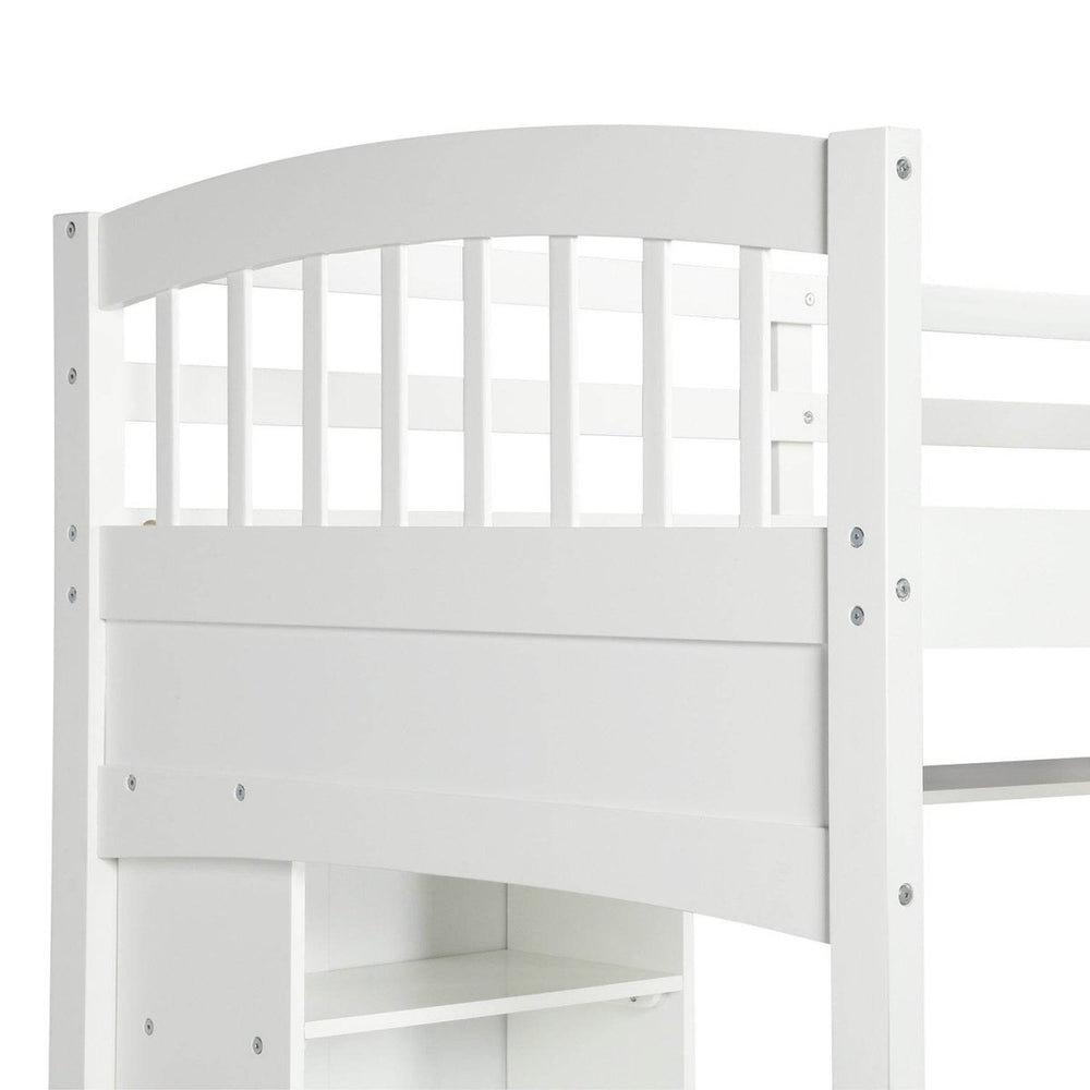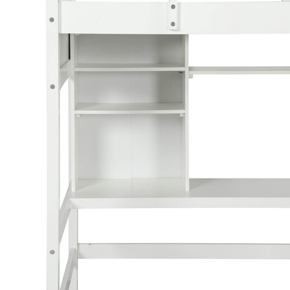 Optimize your child's bedroom with this versatile twin loft bed crafted from solid pine wood and durable MDF. Its elevated design frees up valuable floor space, creating a cozy sleeping area above and a functional workspace below, complete with a built-in desk and two corner shelves. Perfect for homework, reading, or play, the spacious shelves provide ample storage to keep belongings organized and accessible. The sturdy ladder, which can be installed on either side, and secure guardrails ensure safe and easy access to the bed. Designed to fit a standard twin mattress (not included) with 14 supportive slats that eliminate the need for a box spring, this loft bed combines practicality with timeless style. Measuring approximately 80 inches long, 62 inches wide, and 74 inches high, it supports up to 300 pounds, making it ideal for children six years and older. Elevate your child’s room with this multifunctional white loft bed and create a perfect balance of comfort, organization, and fun.