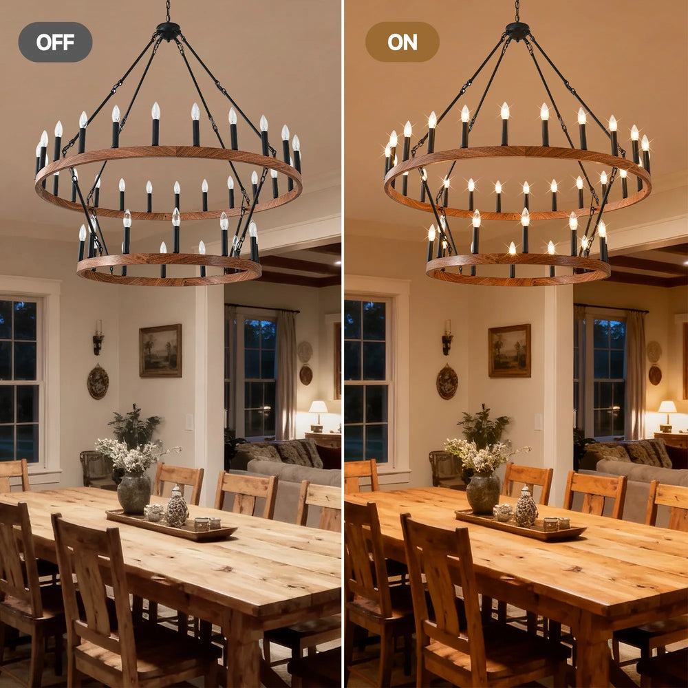 Bring a stunning blend of farmhouse charm and industrial style into your living space with this impressive 47.24-inch round wagon wheel chandelier. Featuring 36 E12 sockets arranged in a two-tier design, this fixture offers 360° illumination, perfect for large dining rooms, foyers, or high-ceiling porches. Crafted from durable iron and metal with an elegant wood grain finish, it complements both traditional and contemporary American designs. The adjustable chain allows you to customize the hanging height to fit your unique space and lighting needs. Easy to install with a pre-assembled lamp body, this chandelier transforms any room into a warm, inviting environment. Add timeless style and bright ambiance to your home today.