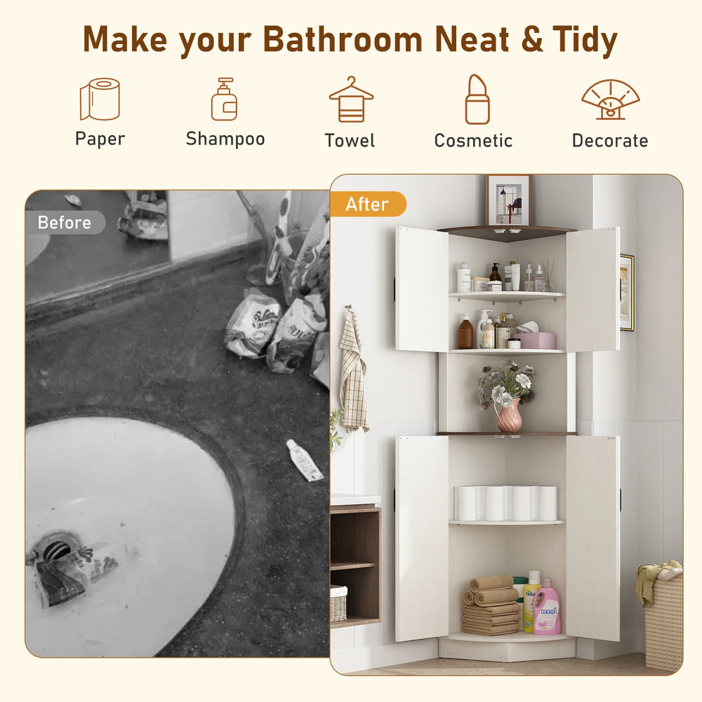 Bring rustic charm and practical storage to your home with this farmhouse-style corner cabinet. Standing 67.5 inches tall, it features an antique weathered wood grain finish accented by sturdy metal trim, adding timeless character to any room. Designed to fit snugly into corners, this cabinet smartly utilizes underused space while offering five levels of versatile storage. Adjustable and detachable shelves allow you to customize the interior for your décor, kitchen essentials, or bathroom supplies. Crafted from durable engineered wood with a waterproof surface and anti-rust coating, it ensures long-lasting use and easy maintenance. The built-in anti-tipping device enhances stability and safety. Ideal for living rooms, kitchens, bathrooms, or home offices, this corner cabinet combines style and functionality. Elevate your home organization today.