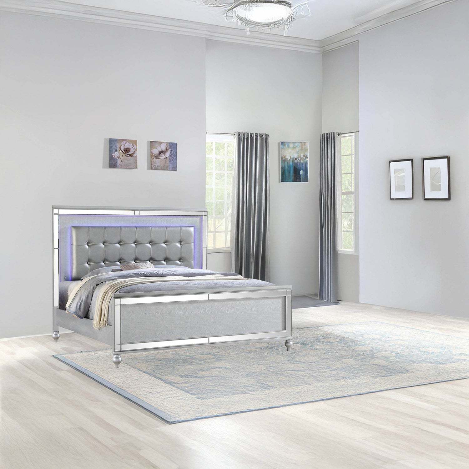 Transform your bedroom into a stylish retreat with the Sterling King Size Upholstered LED Bed. Crafted from sturdy solid wood and MDF with a sophisticated silver finish, this contemporary bed frame blends durability with sleek design. The crystal tufted faux leather headboard offers both comfort and a touch of glamour, perfect for relaxing evenings or cozy mornings. Integrated LED lighting in the headboard allows customizable brightness, creating the ideal ambiance for reading or unwinding. With its spacious king size dimensions—79 inches long by 86 inches wide and 63 inches high—this bed makes a bold statement while providing ample space for restful sleep. Designed to require a box spring, it offers a solid foundation for your mattress and ensures long-lasting support. Elevate your bedroom with this ultra-modern, elegant centerpiece and enjoy comfort that complements your lifestyle.