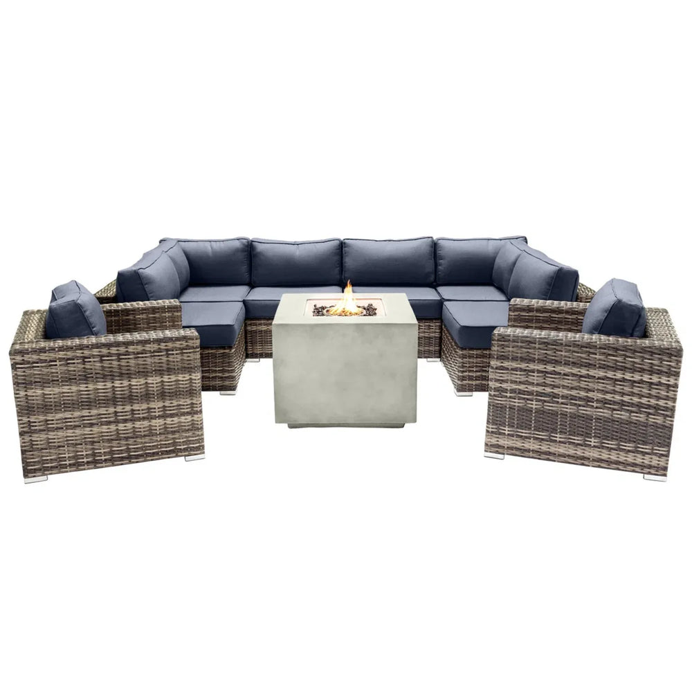 This modern 9-piece outdoor sectional set seats six with deep, water-resistant foam cushions over a UV-resistant wicker frame, featuring a durable concrete fire pit for warmth and ambiance. Fully assembled for effortless garden or patio relaxation and entertaining.
