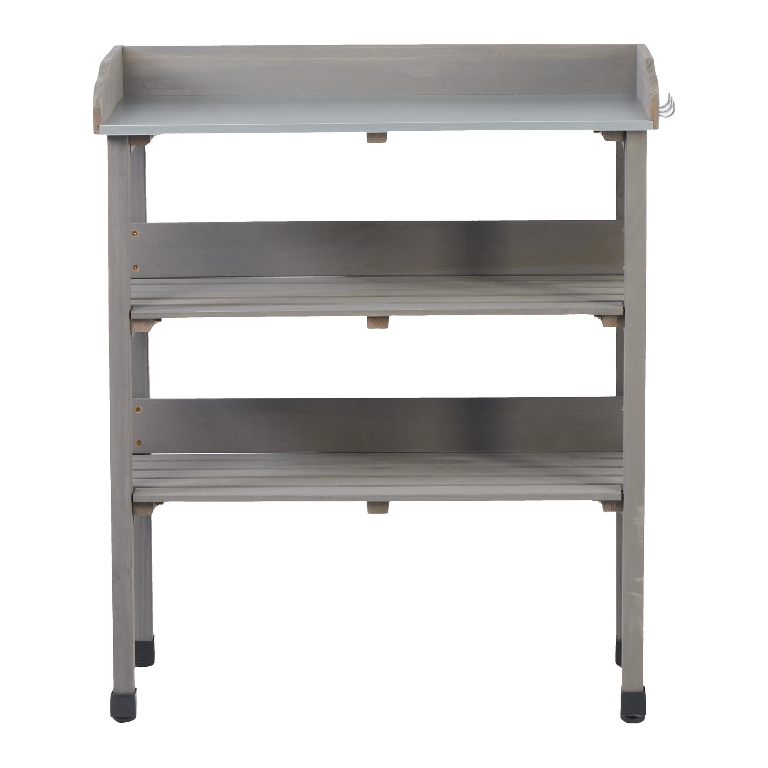 Designed for gardening enthusiasts and DIY hobbyists, this 30″ x 14.5″ x 35.5″ potting table offers a sturdy, multi-functional workstation to streamline your outdoor projects. Crafted from durable fir wood with a sleek grey finish, it features a metal tabletop perfect for potting plants or assembling small projects. The three spacious tiers provide ample storage for tools, gardening supplies, or craft materials, keeping everything organized and within easy reach. Built-in metal hooks add extra convenience for hanging tools or cords, while adjustable feet ensure stability on uneven surfaces. Its compact footprint is perfect for garages, workshops, or backyard gardens, transforming any space into a productive work area. Easy to assemble and strong enough to support up to 120 pounds on the tabletop, this potting table is your reliable partner for all creative tasks. Elevate your gardening or crafting experience today.