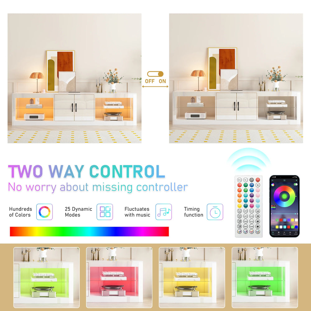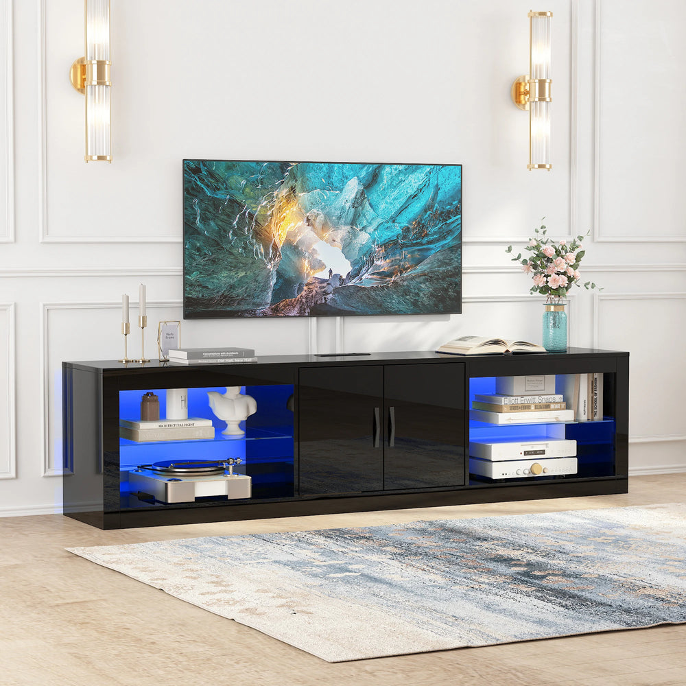 Upgrade your entertainment space with this modern 71.9-inch (182.5 cm) high gloss TV stand designed to support TVs up to 80 inches. Crafted from durable MDF, 15mm particleboard, and tempered glass, it combines style and sturdiness in one sleek package. The built-in RGB LED lights with app and RF controller offer customizable ambiance, perfect for gaming nights, movie marathons, or family gatherings. Featuring two spacious cabinets with doors and four open shelves—including three adjustable tempered glass shelves—this entertainment center provides versatile storage for your media devices, books, and gaming consoles. Integrated USB ports and power outlets keep your electronics charged and organized, while the easy-to-clean high-gloss surface adds a modern touch that resists scratches and spills. Assembly is straightforward with all parts clearly labeled. Elevate your home entertainment today with this contemporary TV stand that blends function, style, and smart features.