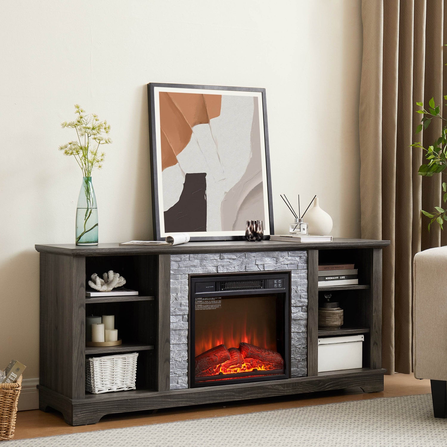 Bring warmth and style together with this modern electric fireplace and media console. Crafted from durable MDF with a grey finish, its faux stacked stone surround adds a timeless charm to your space while providing a cozy ambiance with realistic wood-burning flame effects at the push of a button. Designed to accommodate TVs up to 65 inches, it offers spacious open shelving and adjustable storage cabinets to neatly organize your entertainment devices and accessories. The integrated electric fireplace features adjustable flame brightness, customizable temperature settings from 62℉ to 82℉, and a timer for convenient control, all operated via remote. Its thoughtful cable management system keeps wires out of sight for a clutter-free entertainment center. Combining practicality with elegance, this TV stand is the perfect focal point to elevate your home’s comfort and style. Create your ultimate entertainment retreat today.