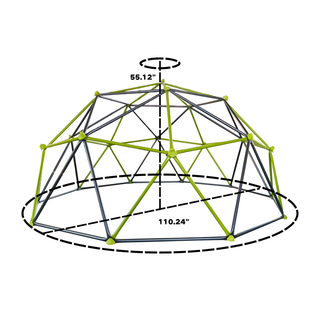 Give children a safe and exciting place to climb, explore, and build physical strength with this ten sided climbing frame. Crafted from durable metal, the half-sphere design measures 110 inches wide by 55 inches tall, offering ample space for adventurous play. Colorful climbing stones are securely attached at every node, providing varied grips that enhance coordination and motor skills. Its sturdy yet lightweight construction makes it easy to set up indoors or outdoors, transforming any play area into a fun fitness zone that promotes balance, agility, and confidence. The sleek black and green finish adds a modern touch to your playground while encouraging healthy, active play. Elevate your child’s outdoor fun and development today.