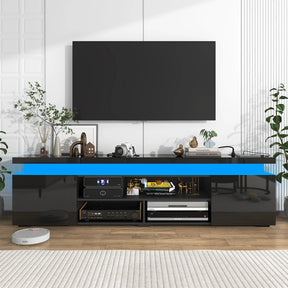 Upgrade your entertainment space with this modern 74-inch LED TV stand, expertly designed to accommodate televisions up to 65 inches. Crafted from durable engineered wood with a sleek high-gloss finish, it offers a stylish yet functional centerpiece for your living room. The integrated power outlet and dual USB ports help you eliminate cord clutter while powering your devices effortlessly. Smart RGB LED lighting, controllable via app or remote, creates a dynamic ambiance that syncs with sound, perfect for movie nights or social gatherings. Spacious storage includes two large cabinets and three open shelves, ideal for gaming consoles, sound systems, and media accessories. Thoughtful cable management keeps your space neat and organized. Easy to assemble and maintain, this TV console brings technology and style together to elevate your home entertainment experience. Transform your living room today.