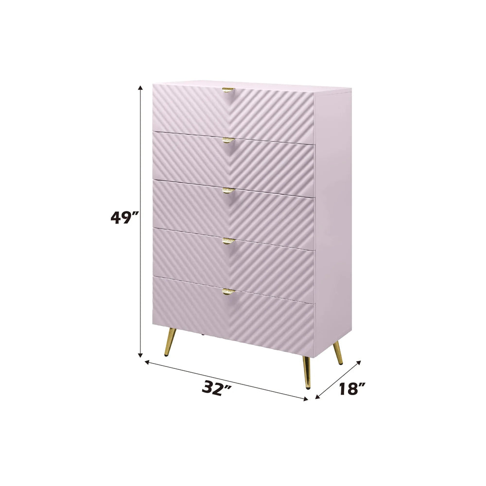 Omega Lifestyles pink high gloss finish chest features a durable composite wood and metal construction with metal legs, wave pattern design, and five metal-glide drawers offering ample storage. Ideal for organized living spaces requiring stylish, functional furniture.