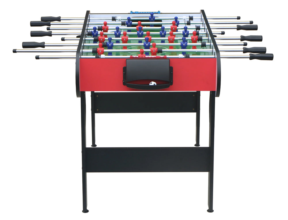 Experience thrilling soccer matches right in your home, office, or game room with this sporty 5-foot soccer table. Crafted from durable MDF and steel, it offers a sturdy, long-lasting playfield perfect for both adults and children. The vibrant white and red PVC panels not only provide an eye-catching American design but also enhance the game atmosphere. Its large 52.75" length and 28.19" width playfield deliver realistic gameplay, while adjustable leg levelers ensure stability on any floor. Whether it’s family game night or friendly office competitions, this foosball table promotes active indoor entertainment and bonding. With four 36mm black and white balls included, you’re ready to kick off exciting matches that sharpen reflexes and teamwork. Elevate your indoor gaming experience today and bring home this must-have table soccer game.