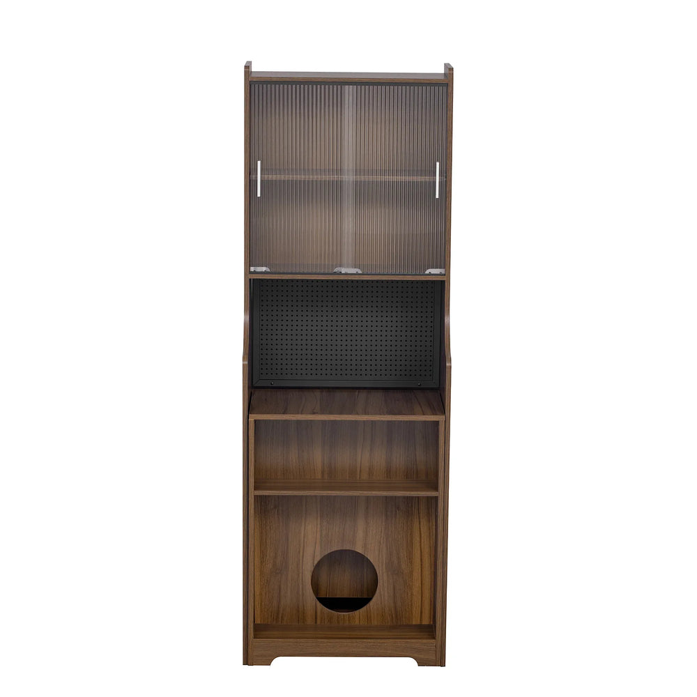 Experience the perfect blend of style, functionality, and pet-friendly design with this modern wooden foldable desk. Crafted from durable MDF and glass with a rich walnut finish, this mid-century modern workstation adapts to your needs with an extendable table that expands from 15.7 to 54.3 inches wide. Standing 68.5 inches tall, it offers ample vertical storage without overwhelming your space—ideal for home offices, gaming setups, or small apartments. Specially designed with feline friends in mind, this desk includes a cozy cat bed, a scratching post, and a hidden litter box compartment to keep pets comfortable and entertained close by. Enhanced with sliding glass doors, a peg board for organized storage, and a warm LED strip for ambiance, it transforms your room into an inviting and practical workspace. Elevate your productivity and your pet’s comfort today.