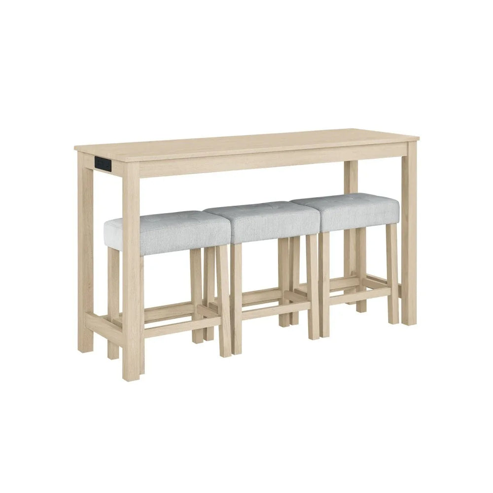 Elevate your home entertaining and dining experience with this versatile 4-piece bar table set. Crafted with solid wood and MDF materials in a stylish light oak finish, the 59-inch table offers a durable, heat-resistant surface perfect for meals, work, or socializing. The integrated power outlet, USB port, and Type-C connector keep your devices charged and within reach, making this set ideal for modern living rooms, kitchens, or apartments. Three linen-upholstered stools provide comfortable seating with sturdy solid wood legs and ergonomic support, while their compact design allows them to tuck neatly under the table to save space. This multi-functional bar set combines industrial durability with farmhouse charm to suit a variety of decor styles. Easy to assemble and built to last, it’s your perfect solution for dining, working, or relaxing in style. Elevate your space and convenience today.