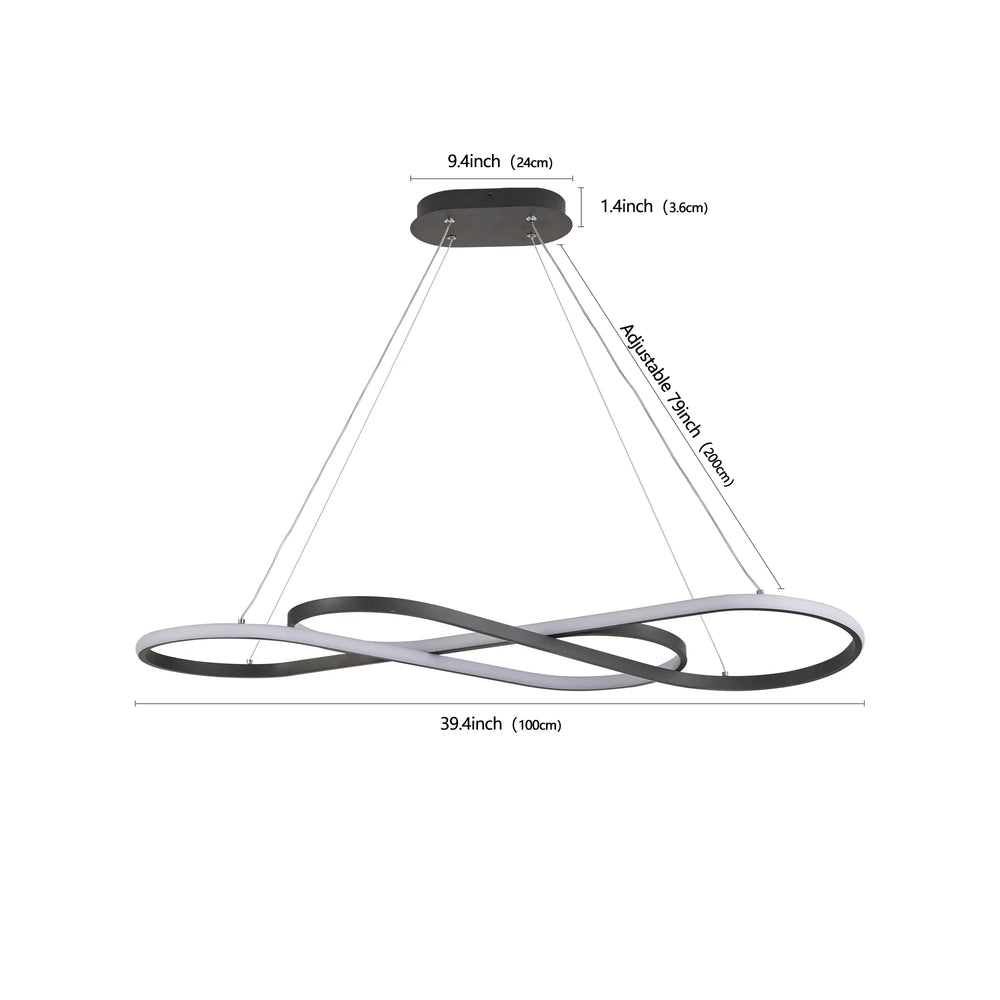 Elevate your living space with this striking 39.4-inch (100 cm) modern LED pendant light, featuring a unique infinity symbol design that brings contemporary elegance to any room. Crafted from durable black aluminum, its sleek silhouette complements living rooms, dining areas, or bedrooms with style and sophistication. The adjustable height allows you to customize the fixture’s placement to perfectly suit your space and lighting needs. Equipped with an energy-efficient LED light source, this pendant provides bright, vivid illumination with a high Color Rendering Index (CRI) of 95, ensuring colors appear true and vibrant. With dimming capabilities (dimmer sold separately) and remote support, you have full control to create the ideal ambiance—from warm, cozy evenings to bright task lighting. Easy to install with all necessary accessories included, this pendant light is a perfect blend of art and function. Transform your room and brighten your moments—upgrade your lighting today.
