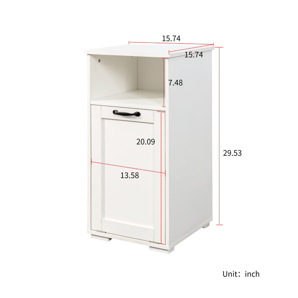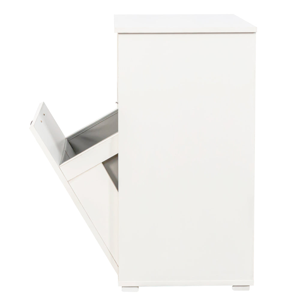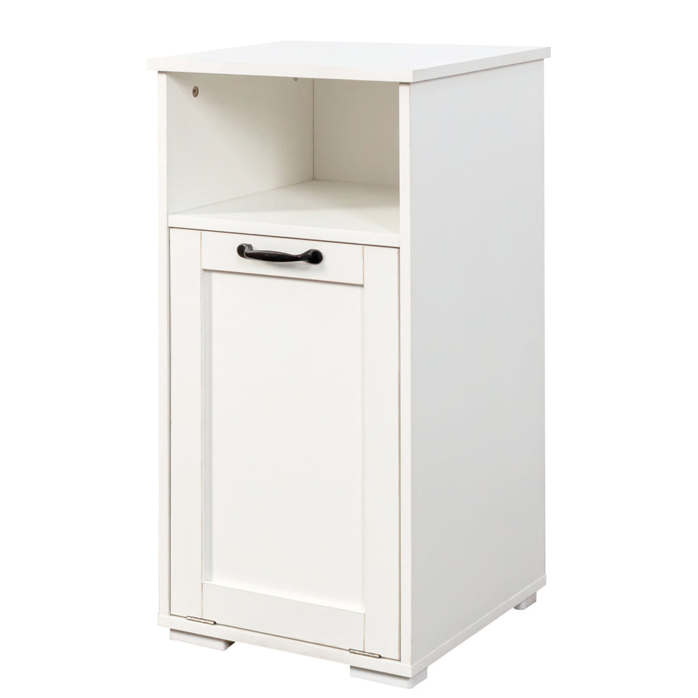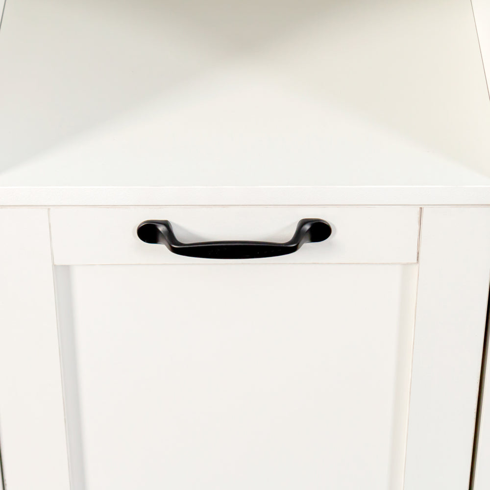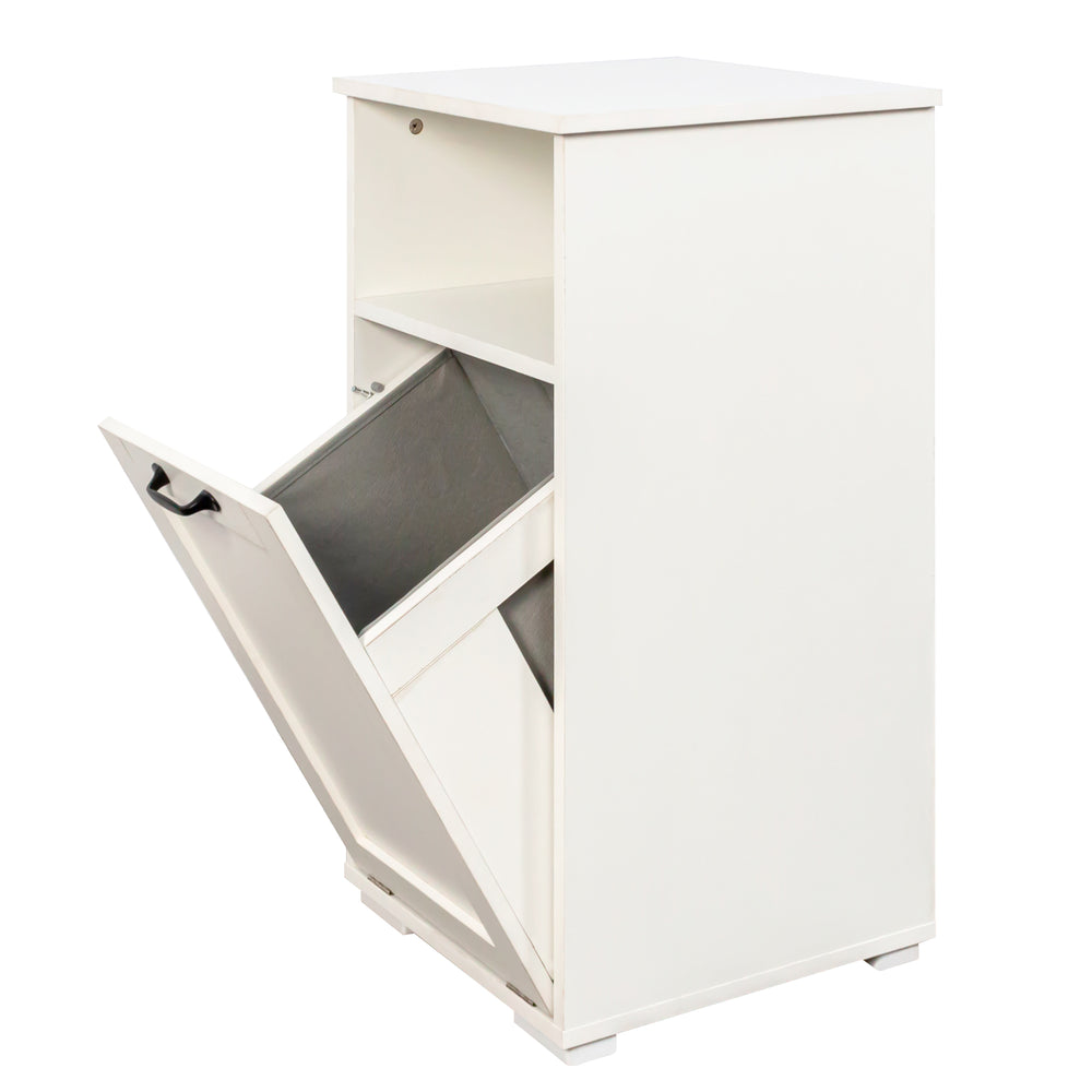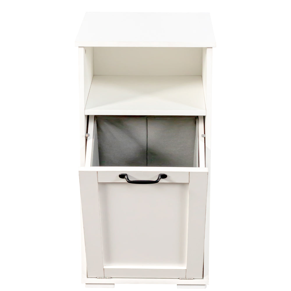 Make laundry day simpler and more efficient with this compact laundry cabinet designed to fit perfectly in small spaces like dorms and apartments. Featuring a removable liner bag, it lets you easily transport clothes to the washer without hassle. The divided compartments streamline sorting, helping you keep whites, colors, and delicates separated with ease. Crafted from durable particle board and MDF with a melamine finish, this cabinet is built for long-lasting use and easy cleaning. Its sleek white design adds a timeless, clean look that complements any room while hiding dirty laundry behind an easy-open door. An open shelf provides convenient storage for detergents, toiletries, and towels, keeping essentials within reach and your space clutter-free. Elevate laundry organization and simplify your routine today.