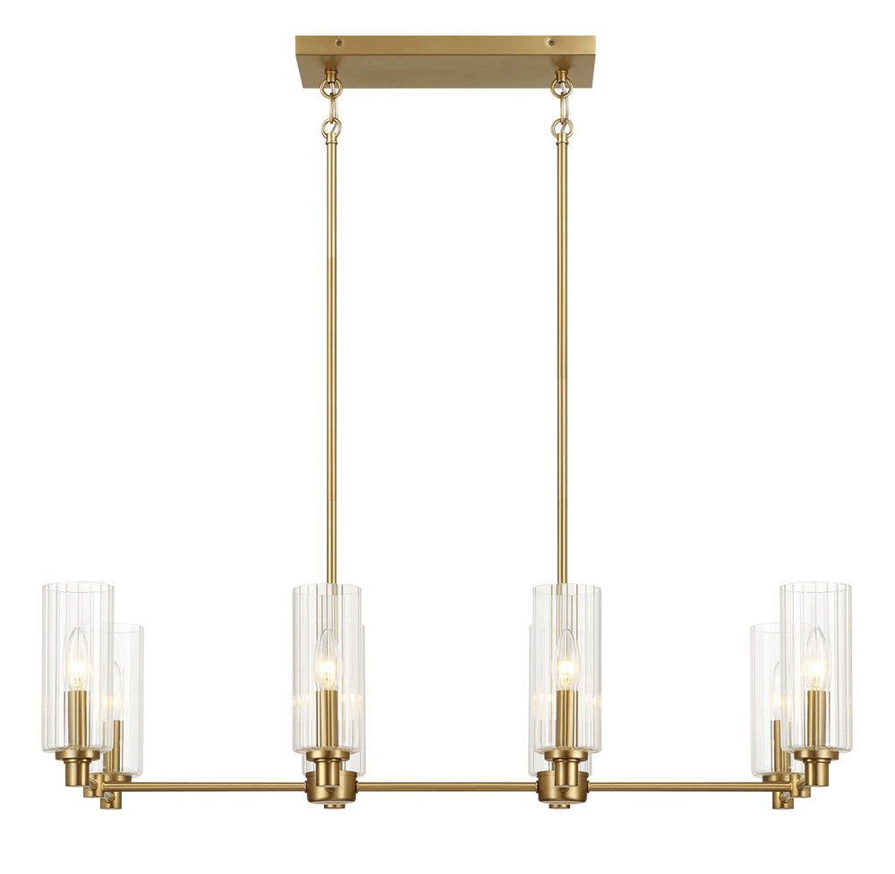 Elevate your kitchen or dining area with the Willow Eight Lights Island pendant lamp, featuring a stunning satin brass finish and clear ribbed glass shades. This ceiling light fixture combines classic charm with modern sophistication, casting warm, inviting light from its eight incandescent bulbs. The textured glass diffuses light beautifully, creating a cozy ambiance while showcasing exquisite craftsmanship. With a sleek 36-inch length and a slim 15-inch width, this statement piece fits perfectly over islands or breakfast bars, adding both style and function to your living space. Upgrade your home lighting and transform everyday moments into elegant experiences. Brighten your surroundings with timeless design—shop the Willow Island Light today.