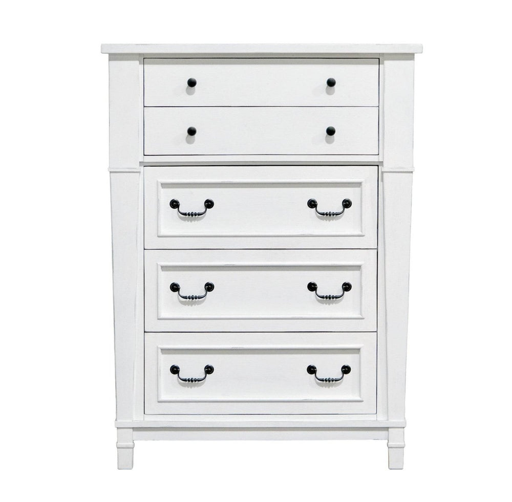 White 5-drawer chest features engineered wood construction with a weathered white farmhouse style, offering spacious storage and easy assembly. Its durable design and classic look enhance organization and complement rustic or traditional home decor.