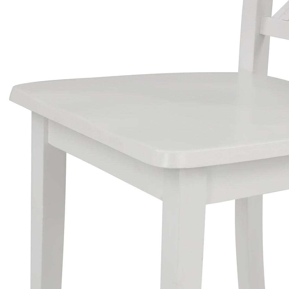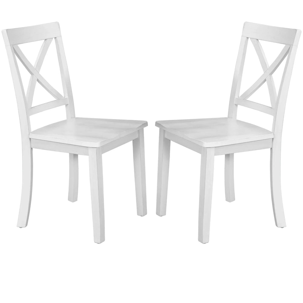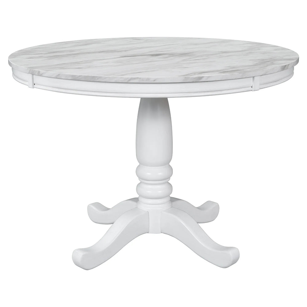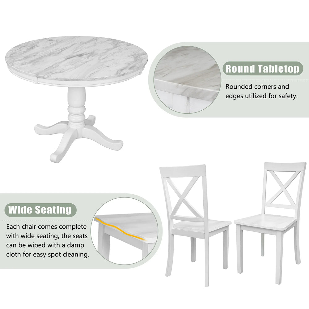 Bring modern elegance and functionality to your kitchen or dining room with this 5-piece dining table and chair set. Crafted from solid wood and MDF with a faux marble tabletop, it offers a stylish yet durable foundation for family meals and gatherings. The white finish blends seamlessly with various décor styles, creating a bright and inviting space for breakfast, lunch, dinner, or afternoon tea. Four solid wood chairs provide sturdy, comfortable seating with a strong weight capacity of up to 250 lbs (113 kg) each. Designed for easy assembly, this set combines lasting quality with a compact footprint ideal for homes looking to maximize space without sacrificing style. Elevate your dining area today with this timeless, versatile set.
