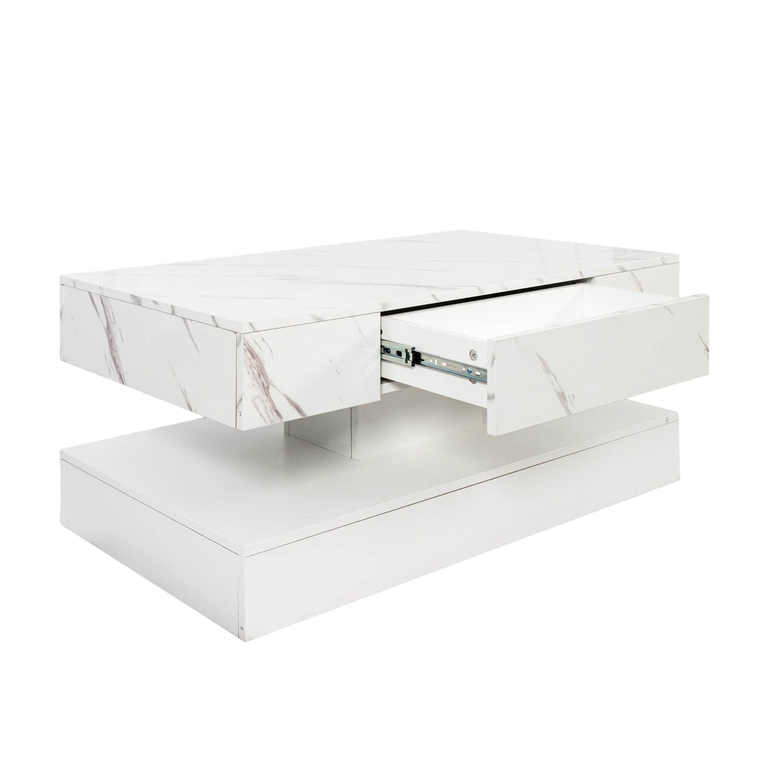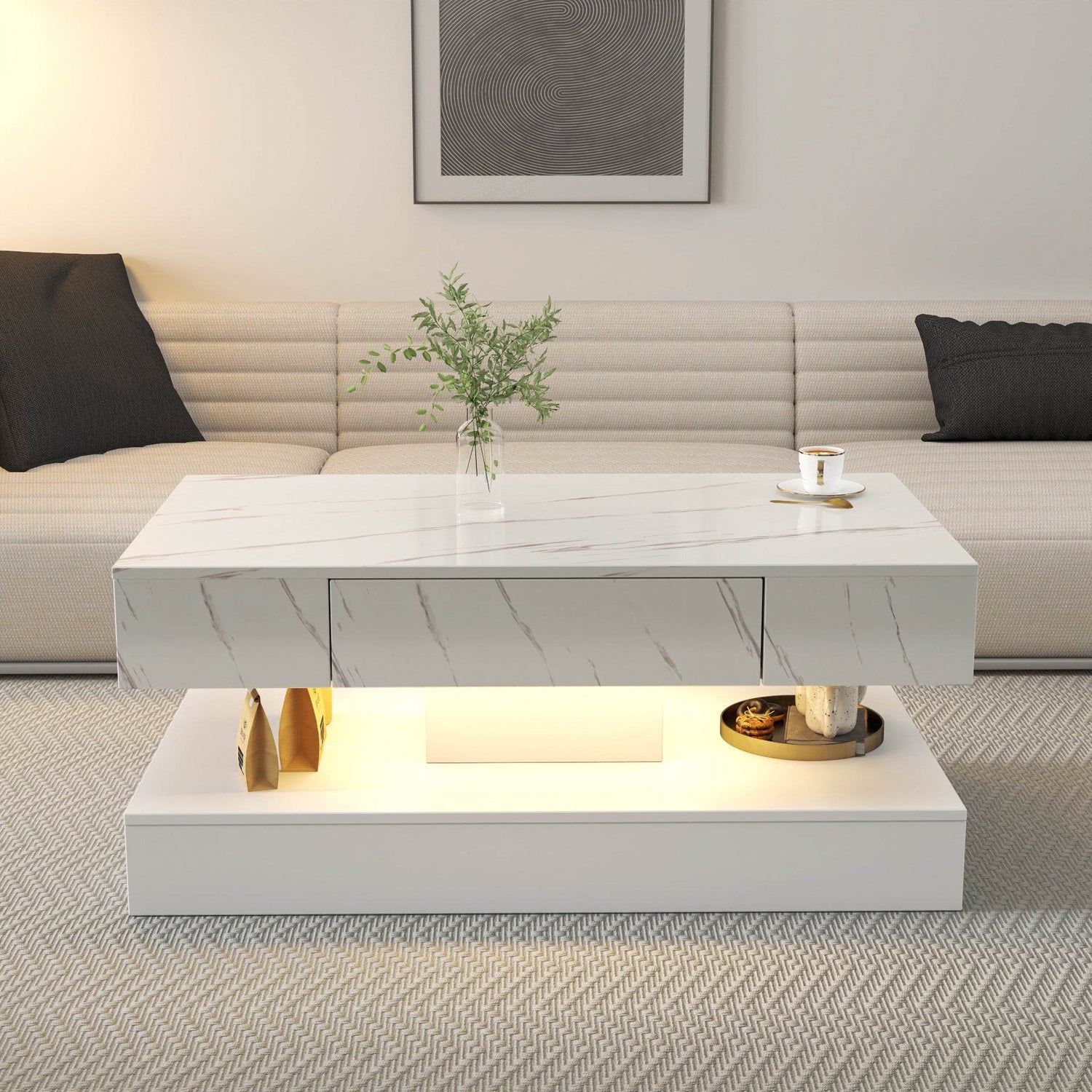 Modern LED Coffee Table features white marble finish with durable particle board and MDF construction, built-in drawer for storage, and remote-controlled RGB LED lighting to enhance living rooms, bedrooms, and offices with versatile style and organization.