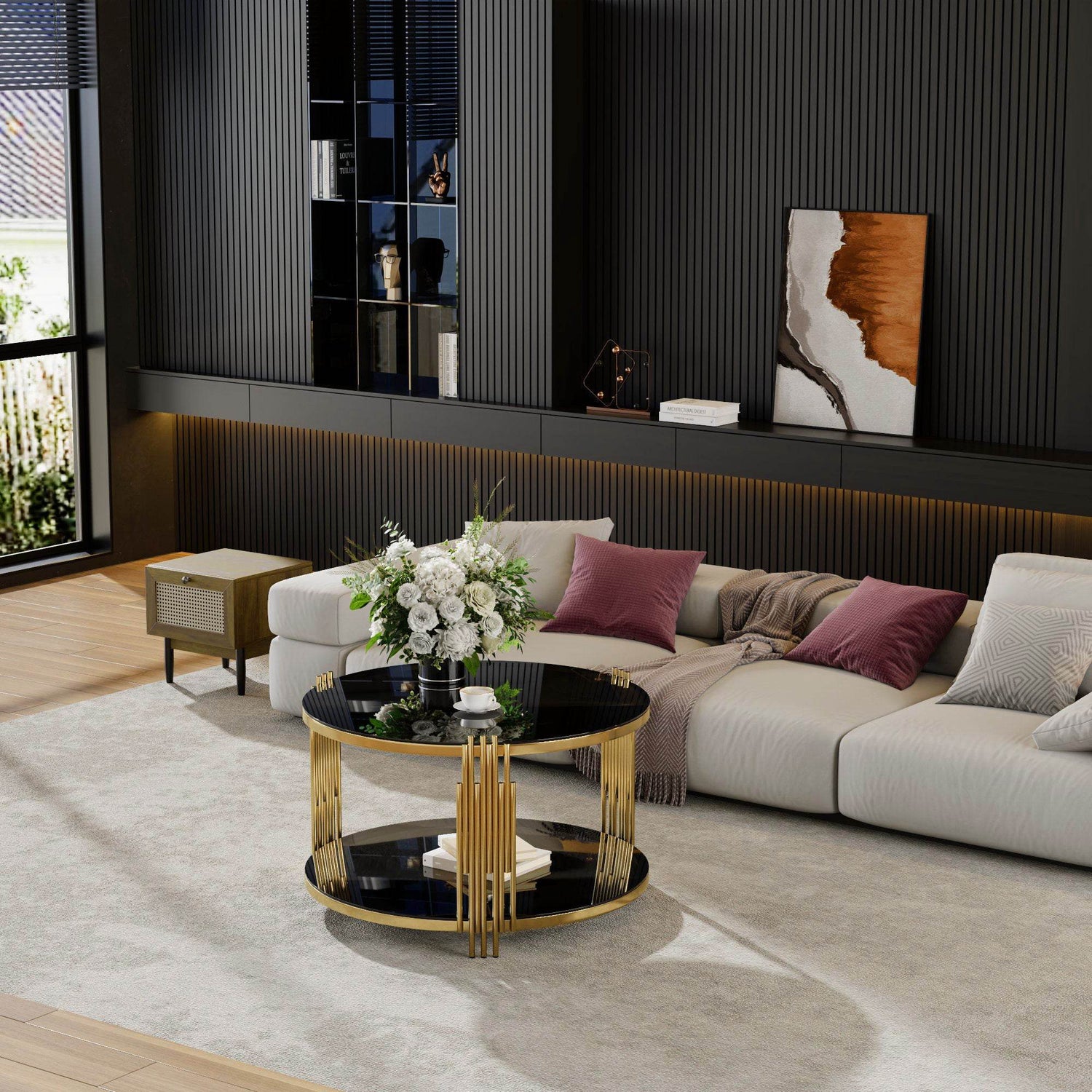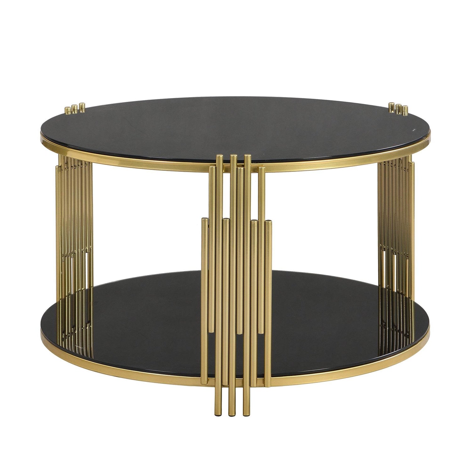 Make a bold statement in your home with this modern black mirror coffee table featuring an eye-catching asymmetrical metal frame. The sleek tempered glass top enhances your space with a reflective surface that adds depth and sophistication. Supported by a circular metal drum base with a striking gold finish, this table combines stability with stylish flair. Its clever lower shelf offers practical storage or display space for books, magazines, and décor, maximizing functionality without sacrificing style. At 31.5 inches in length and width, and 19.7 inches high, this round coffee table fits perfectly in contemporary living areas, balancing form and function. Crafted from durable metal, it’s built to last and easy to maintain. Assembly is quick and straightforward—upgrade your home décor and enjoy modern elegance today.