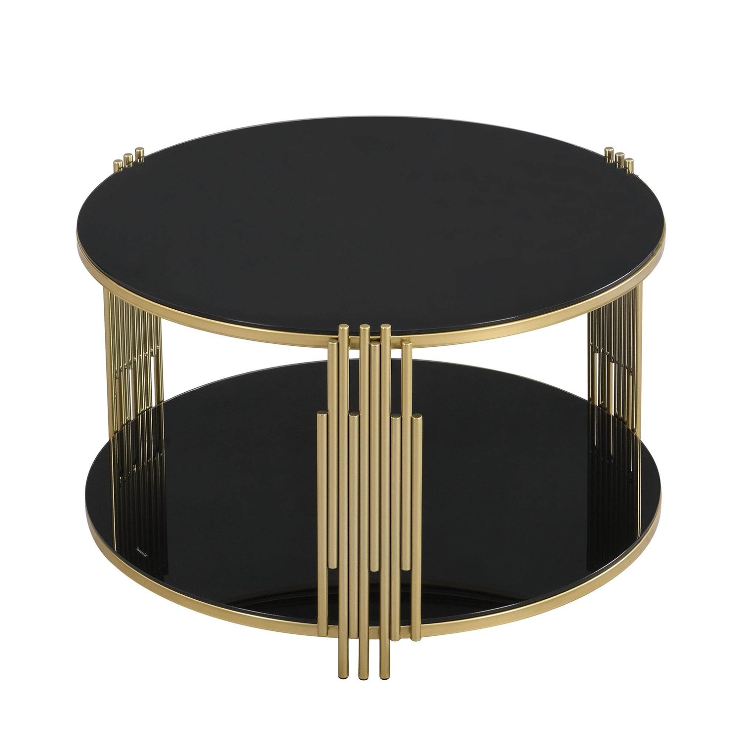 Modern black mirror coffee table features an asymmetrical metal frame with a circular gold-finish drum base and lower shelf for extra storage. Tempered glass top enhances elegance and spaciousness, while durable metal construction ensures stable, long-lasting use.