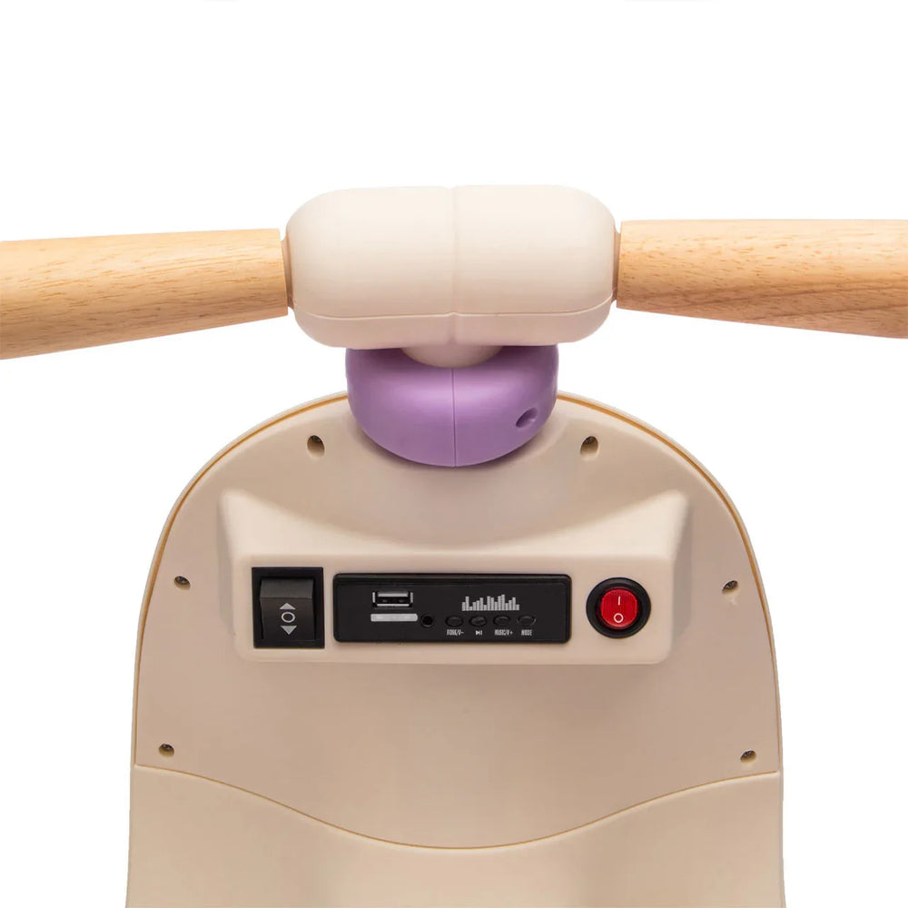 This toddler scooter features a sturdy 3-wheel polypropylene design with wide anti-slip wheels for stability, dual motors with smooth soft-start, an ergonomic wide seat, parent remote control, and safety lights with Bluetooth speakers, perfect for safe fun and confidence building in children aged 1–3 years.