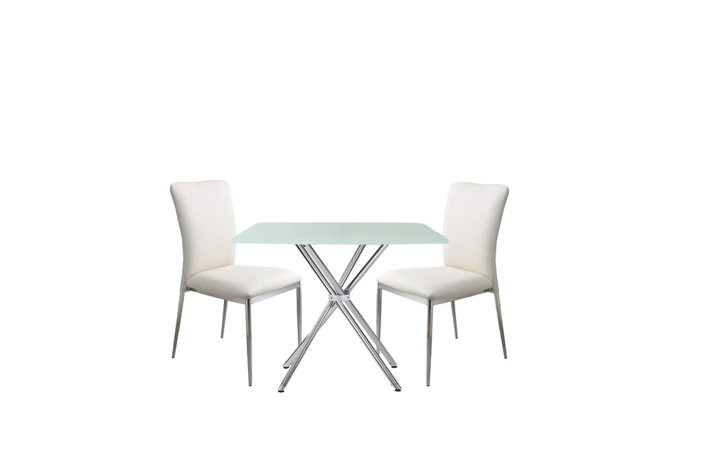 Elevate your dining experience with this chic 3-piece Modern Elegance Dining Set, designed to bring refined simplicity to any dining room. The square 36-inch tempered frosted glass tabletop, supported by sleek chrome legs with a secure safety disk connection, adds a modern flair that complements a variety of interior styles. Two upholstered chairs, featuring comfortable foam-filled faux leatherette in soft white, provide plush seating with solid backs and sturdy brushed chrome legs. Ideal for compact spaces, this set creates a sophisticated breakfast nook or dining corner without sacrificing style or comfort. Its durable, anti-scratch finish ensures lasting beauty through everyday use. Whether it's your morning coffee or an intimate dinner, this contemporary dining set enhances your home with timeless appeal. Elevate your space with graceful simplicity today.