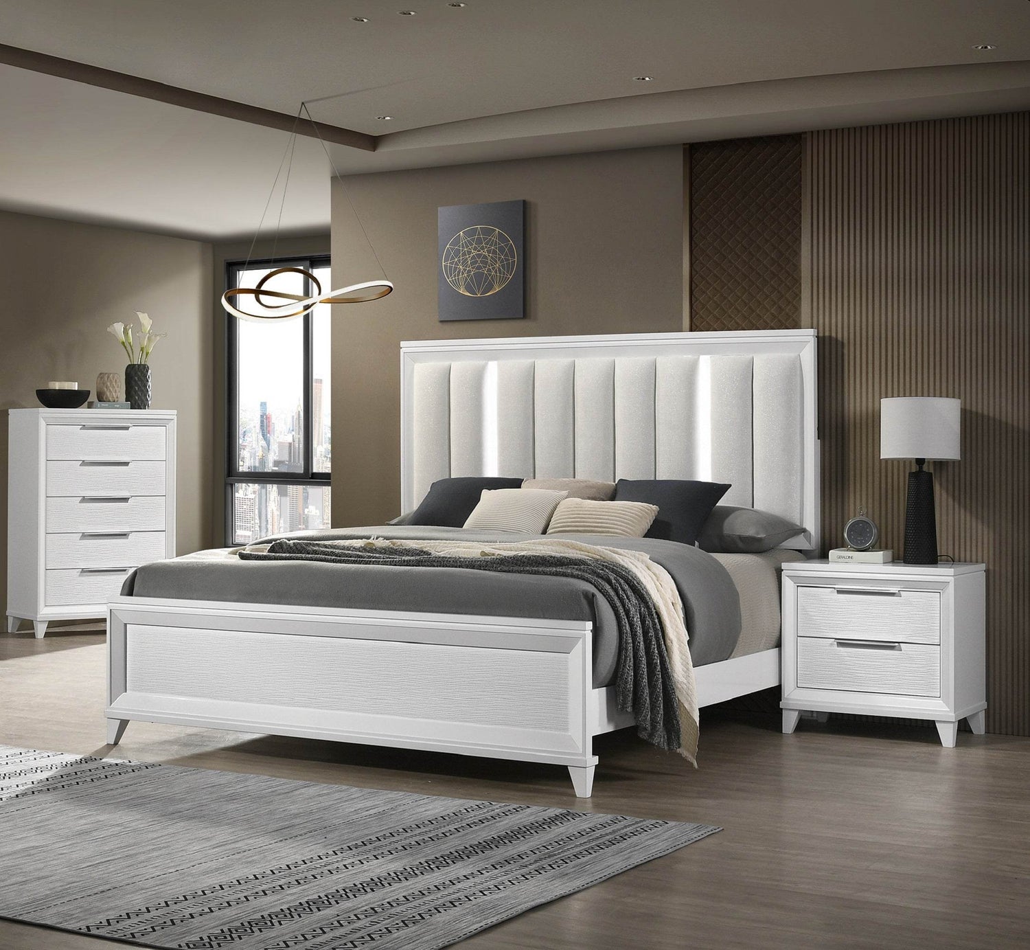• Modern white finish brightens bedroom, inspiring joy and serene escape