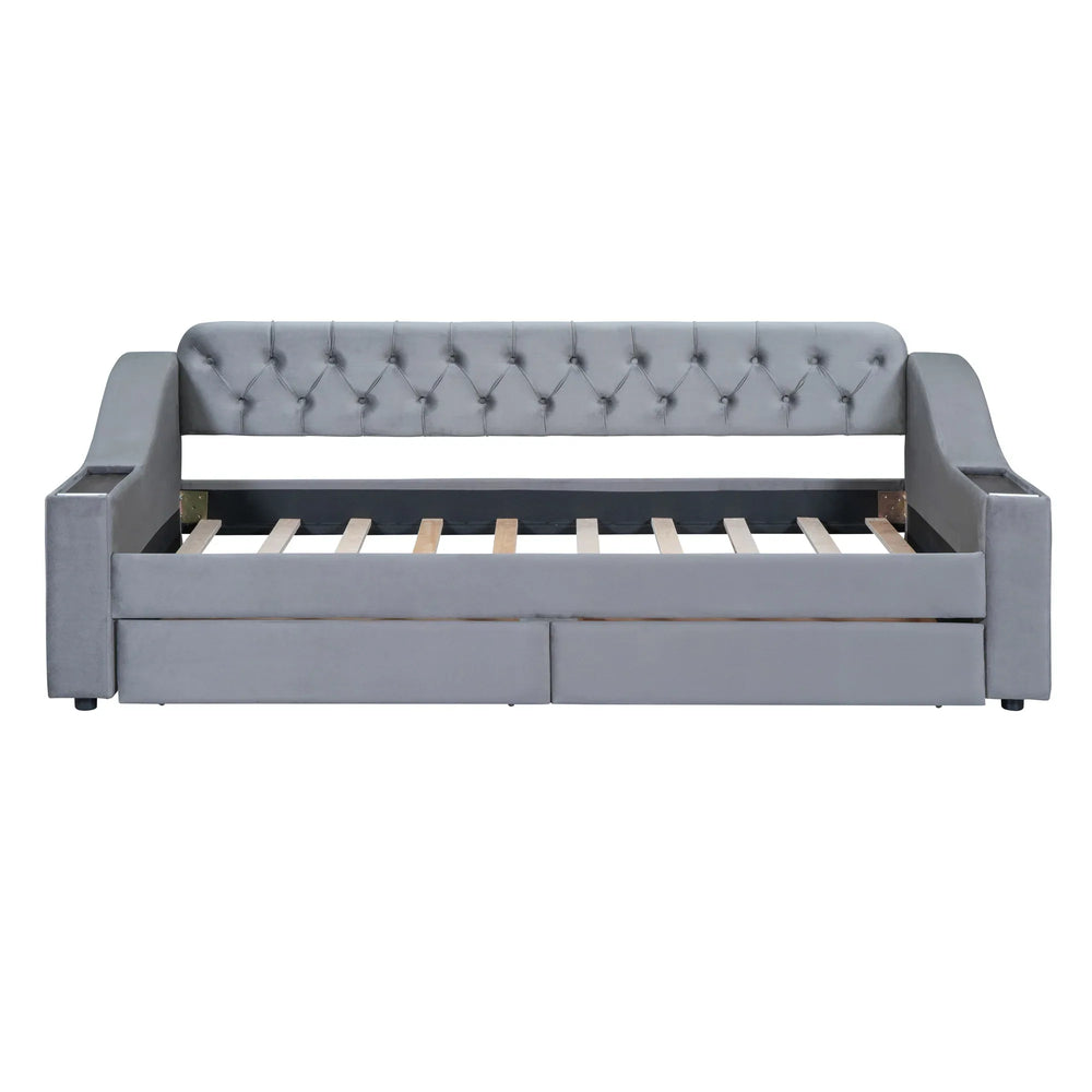 Experience a perfect blend of style and functionality with this twin size upholstered daybed in elegant gray velvet. Its button-embossed design adds a sophisticated artistic touch, making it a striking focal point in any room. Crafted with a sturdy MDF frame and supported by 10 durable wooden slats, this bed offers stable and reliable mattress support without the need for a box spring. Ideal for small spaces, it features two large smooth-gliding drawers that provide generous storage for bedding, clothes, or other essentials, keeping your room tidy and organized. Conveniently equipped with USB ports on both sides, it lets you easily charge devices or power bedside lighting. Whether used for lounging or sleeping, this daybed delivers comfort and practicality in one sleek package. Elevate your home décor and storage solutions today.