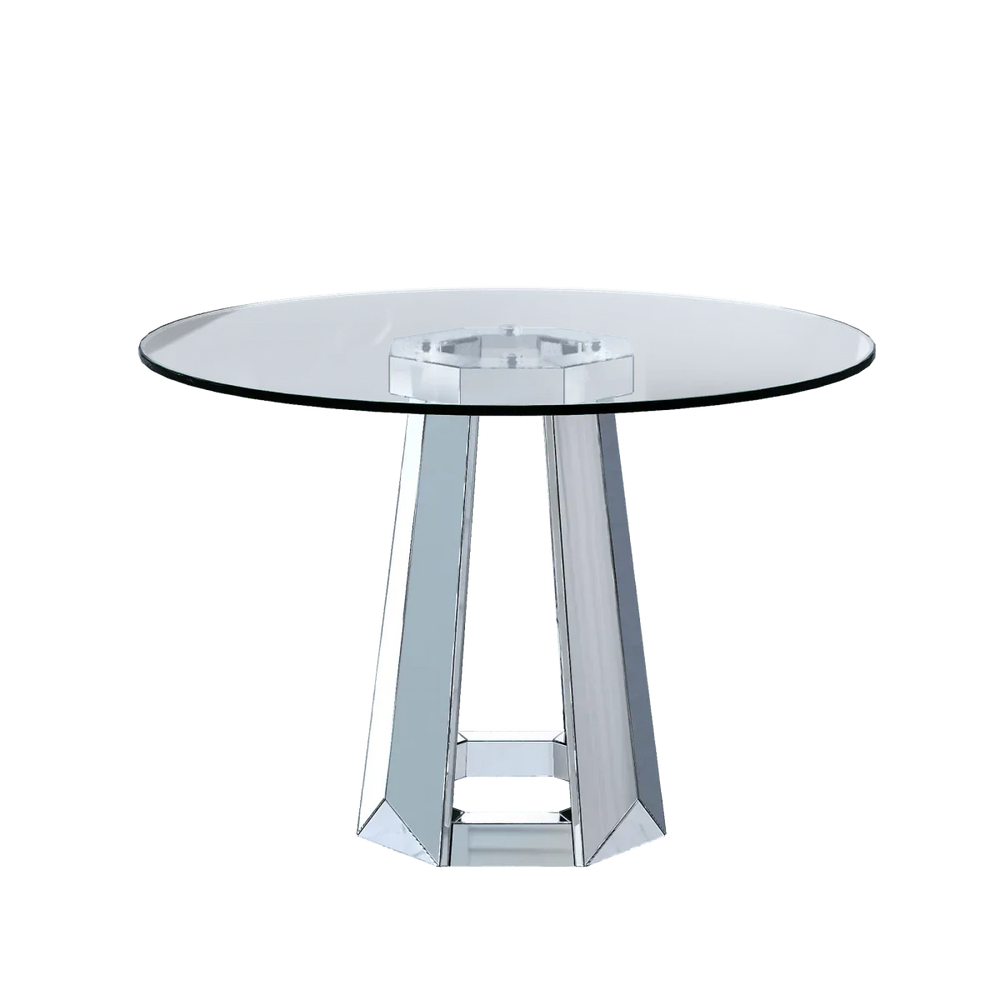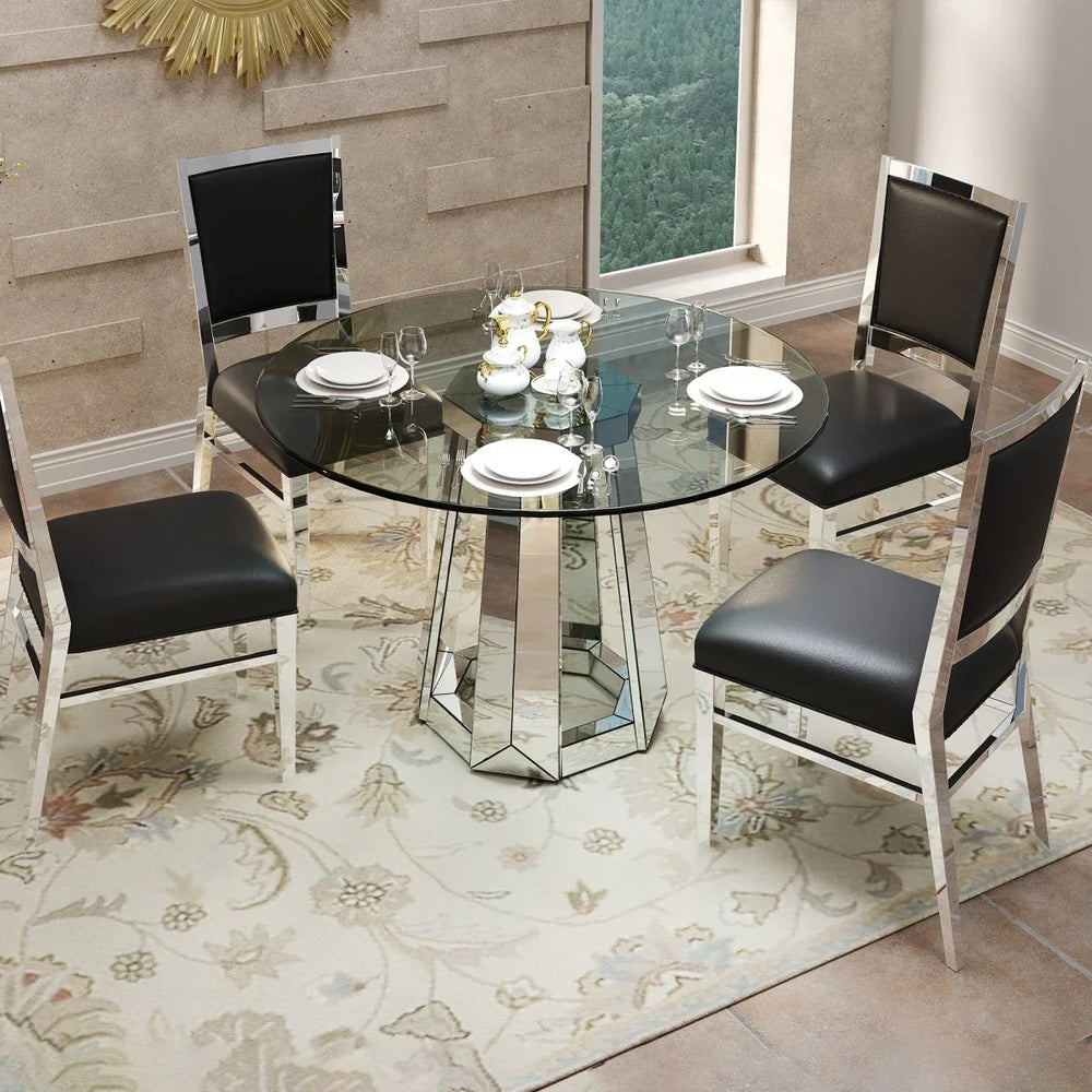 Modern round dining table features a sleek 15mm tempered glass top with a mirrored geometric base for durability and easy cleaning. Its spacious design comfortably seats four, creating a stylish and functional centerpiece for contemporary dining rooms.