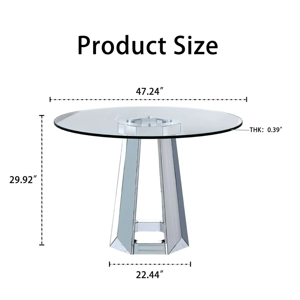 Bring sleek sophistication to your dining space with this modern minimalist round dining table. Featuring a sturdy mirror-surfaced round base and a 15mm thick tempered glass top, this table offers a stylish focal point that enhances any kitchen or dining room. The smooth glass surface is easy to clean and durable enough for everyday use, while the geometric mirror base adds a unique, reflective touch that brightens your space. Designed to comfortably seat four, it creates the perfect setting for intimate dinners and social gatherings. Its compact 47-inch diameter and 30-inch height make it ideal for apartments and open-concept homes. Effortless assembly means you can enjoy your new centerpiece without hassle. Upgrade your dining area with this elegant, space-saving table today.