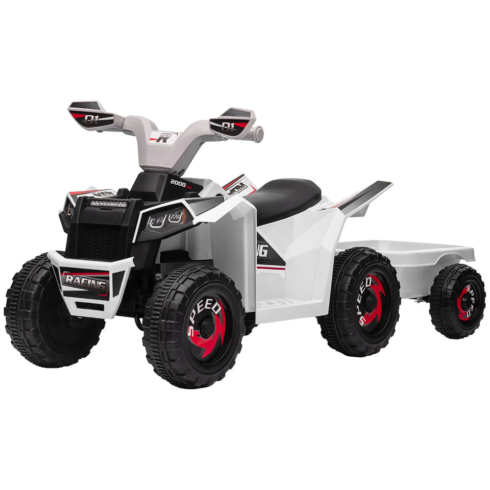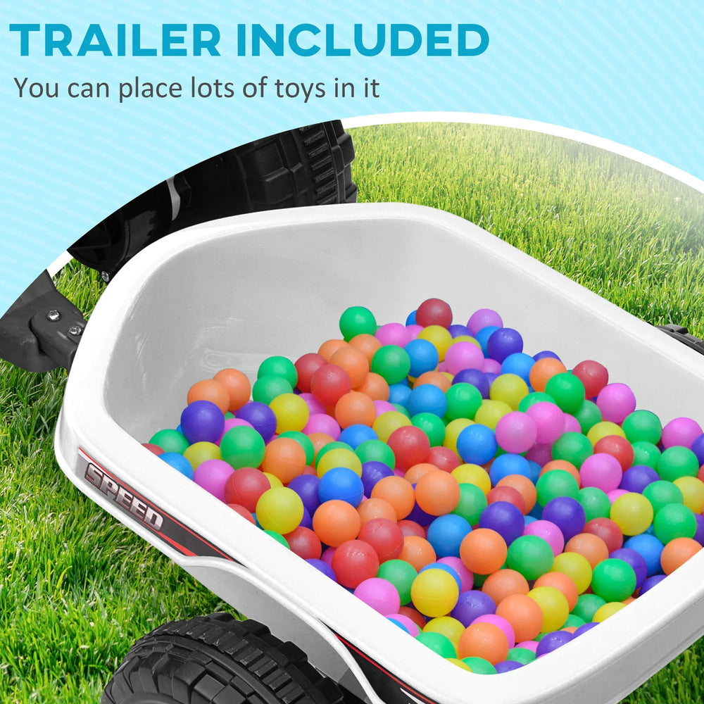 Kids electric ATV with cargo trailer features wear-resistant wheels and foot pedal controls for forward and reverse at a safe speed of 1.6 mph, offering smooth, fun rides for toddlers aged 18-36 months and easy steering with non-slip handlebars.