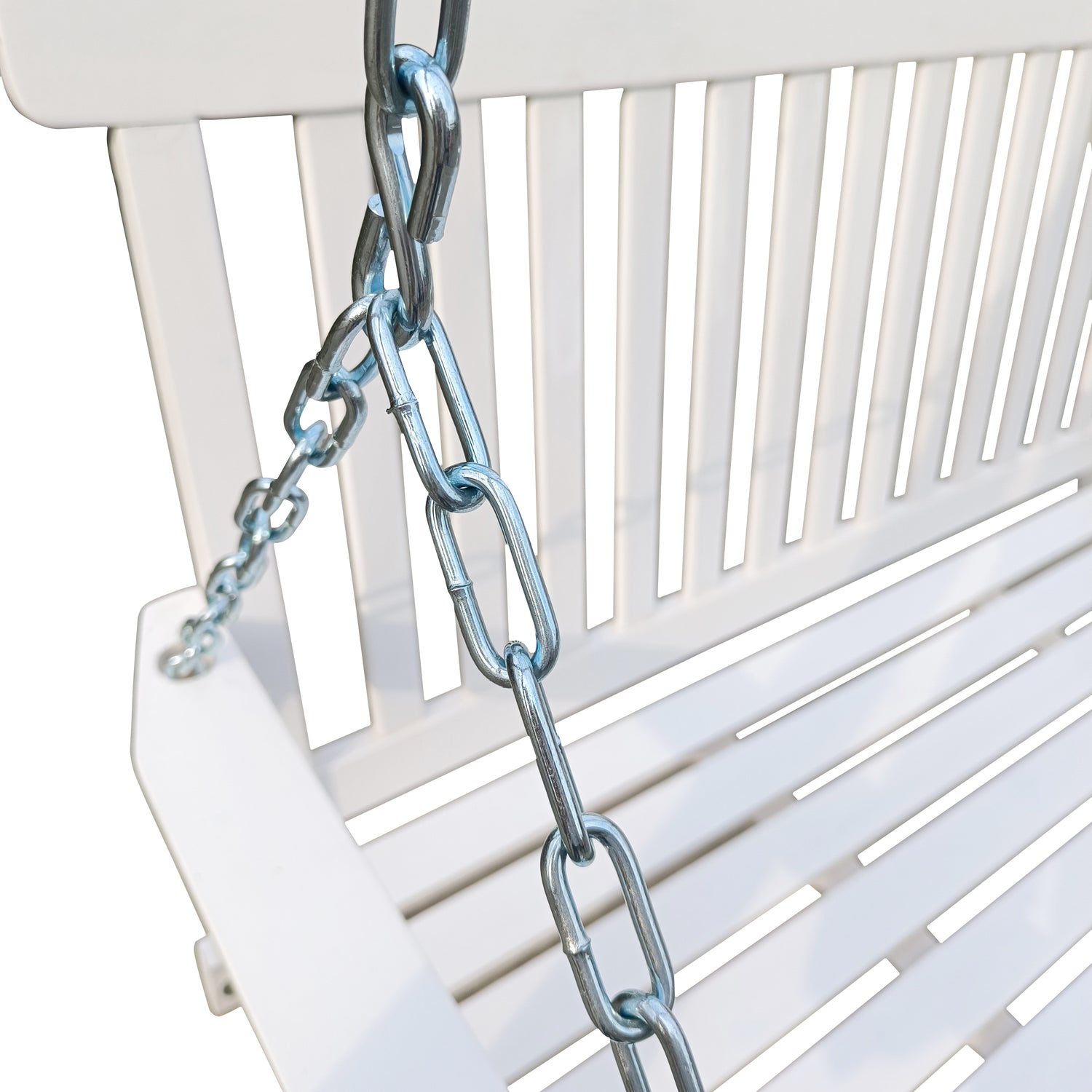 Create a charming retreat on your patio or sunroom with this classic white wooden porch swing. Crafted from solid fir wood, this swing offers a spacious seat designed to comfortably accommodate two people with a strong 800-pound weight capacity. Its smooth painted finish is treated with weather-resistant varnish to protect against the elements, ensuring lasting beauty and durability. The sturdy hanging chains are zinc-plated for rust resistance and provide safe, secure suspension from any solid overhead structure. With armrests adding extra comfort, this swing invites you to relax and unwind outdoors or indoors with ease. Easy to assemble with included hardware and instructions, it’s the perfect addition to elevate your outdoor living space. Bring home peaceful, stylish seating that blends functionality with classic design—elevate your relaxation today.