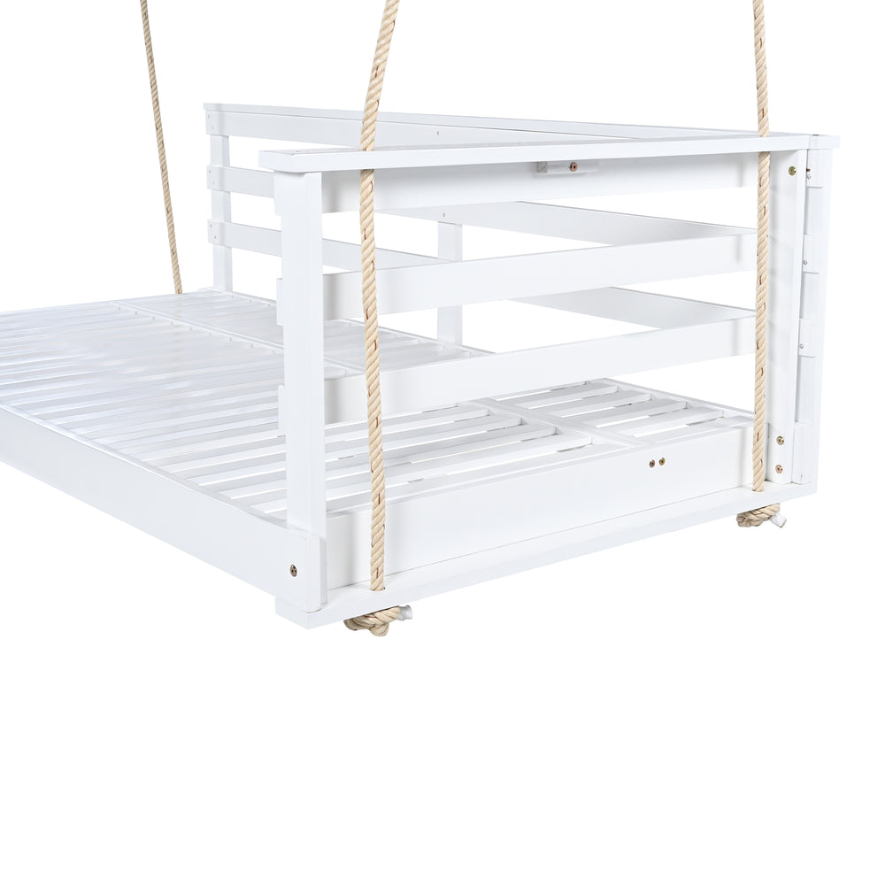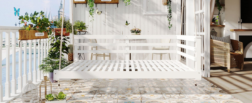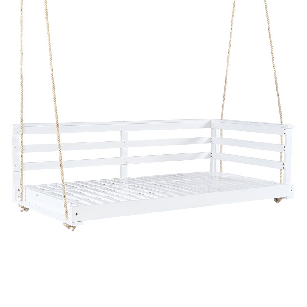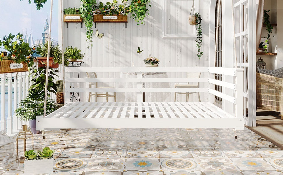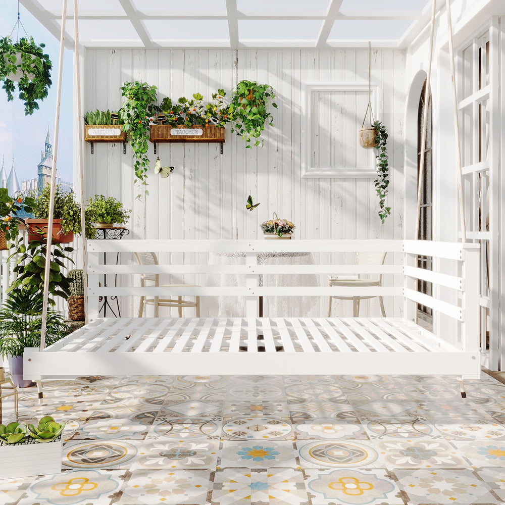 Bring comfort and rustic charm to your patio or garden with this handcrafted twin-size swing daybed. Made from premium acacia wood, its weather-resistant frame offers long-lasting durability and a natural white finish that complements any outdoor décor. The spacious 80 x 40.9 inch platform comfortably fits a standard twin mattress (not included), allowing you to lounge, read, or nap in serene style. Four strong 96-inch hemp ropes ensure secure hanging and support up to 350 lbs, delivering both safety and stability. Featuring a minimalist country design with an open-side rail, this swing bed is as functional as it is inviting. Easy to assemble with included hardware, it’s the perfect addition for your backyard relaxation spot. Elevate your outdoor living space today.