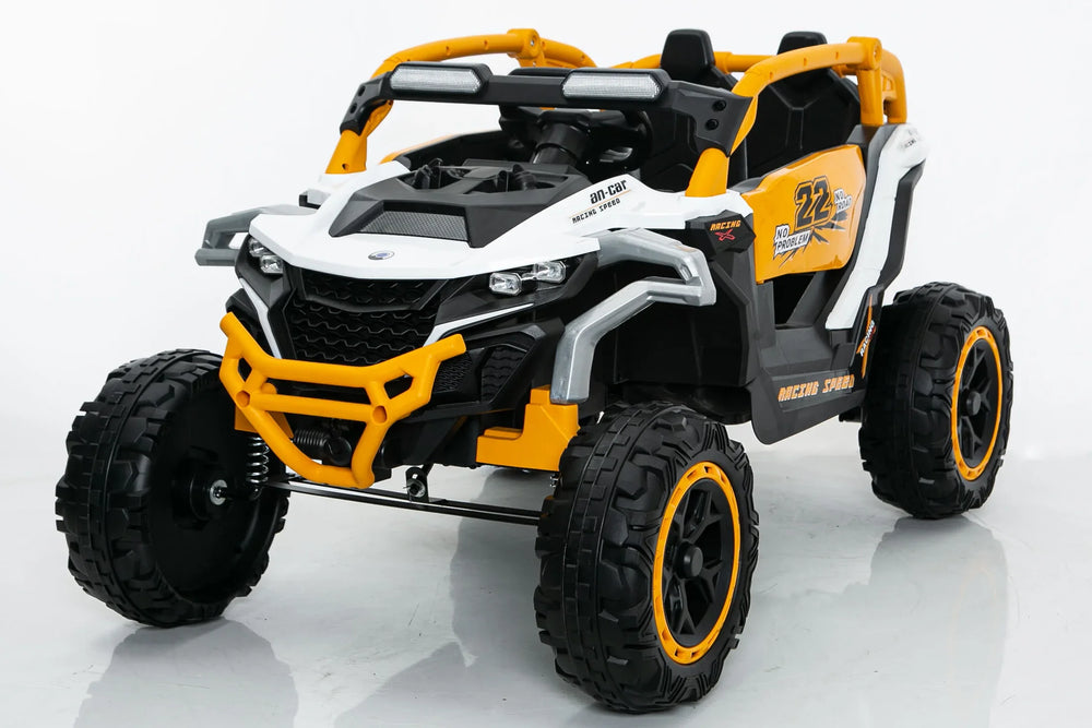 Give your child the gift of outdoor fun and imaginative play with this 2-seater electric ride-on vehicle designed for kids aged 3 to 6. Featuring a durable polyethylene body in vibrant yellow and white, this ride-on truck offers smooth rides indoors or outdoors thanks to its front and rear shock suspension. Powered by a 12V 7Ah battery, it delivers up to 60 minutes of continuous play with three adjustable speeds, letting your child explore safely and confidently. Parents can maintain control remotely, ensuring peace of mind during every adventure. Realistic details such as openable doors, working flashlights, a horn, and a built-in music player provide an immersive driving experience. Compact and lightweight at just 35.7 pounds, this UTV is the perfect size to enhance coordination and motor skills, making it an exciting and safe gift that kids will love. Elevate playtime and ignite your child’s imagination today.
