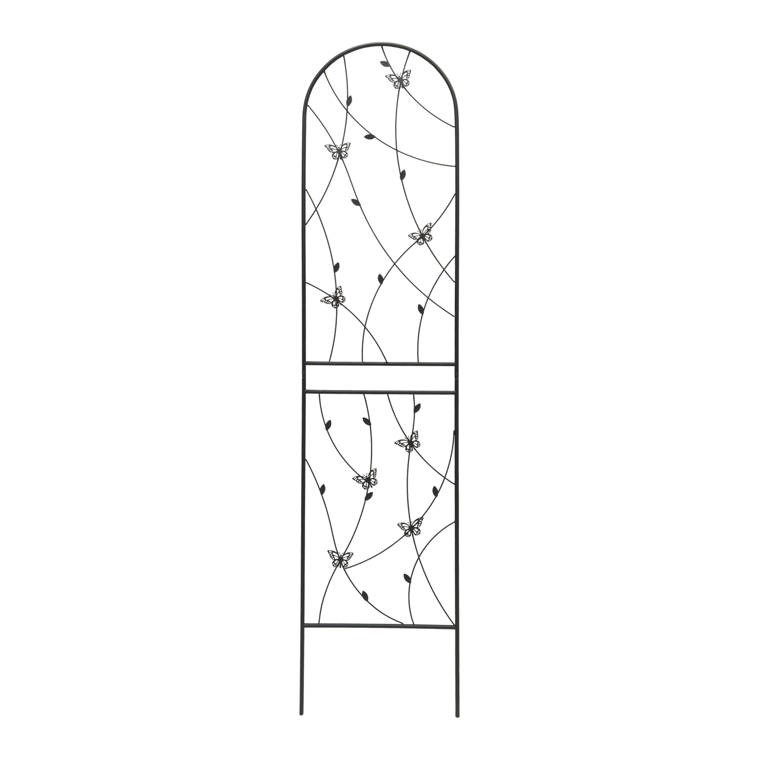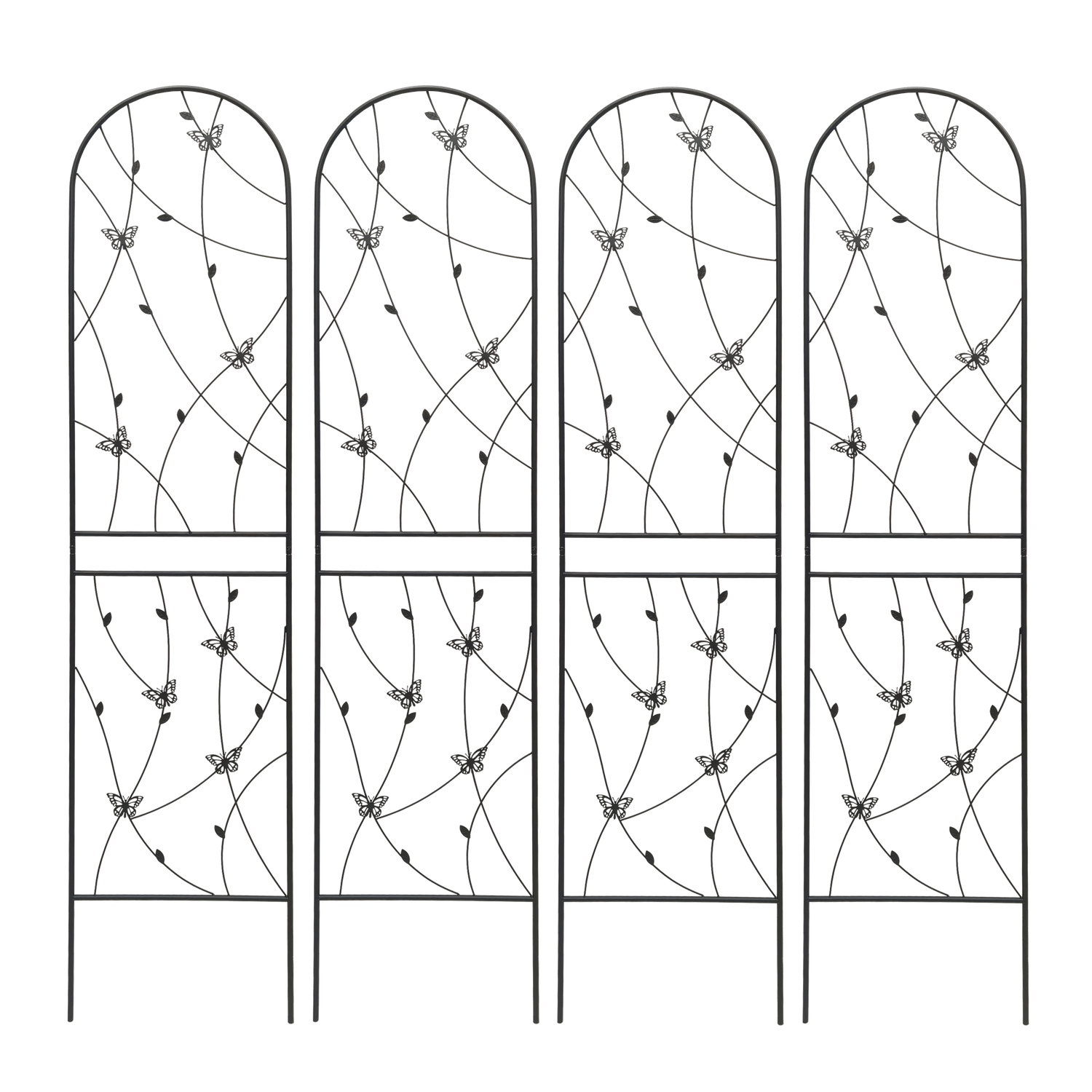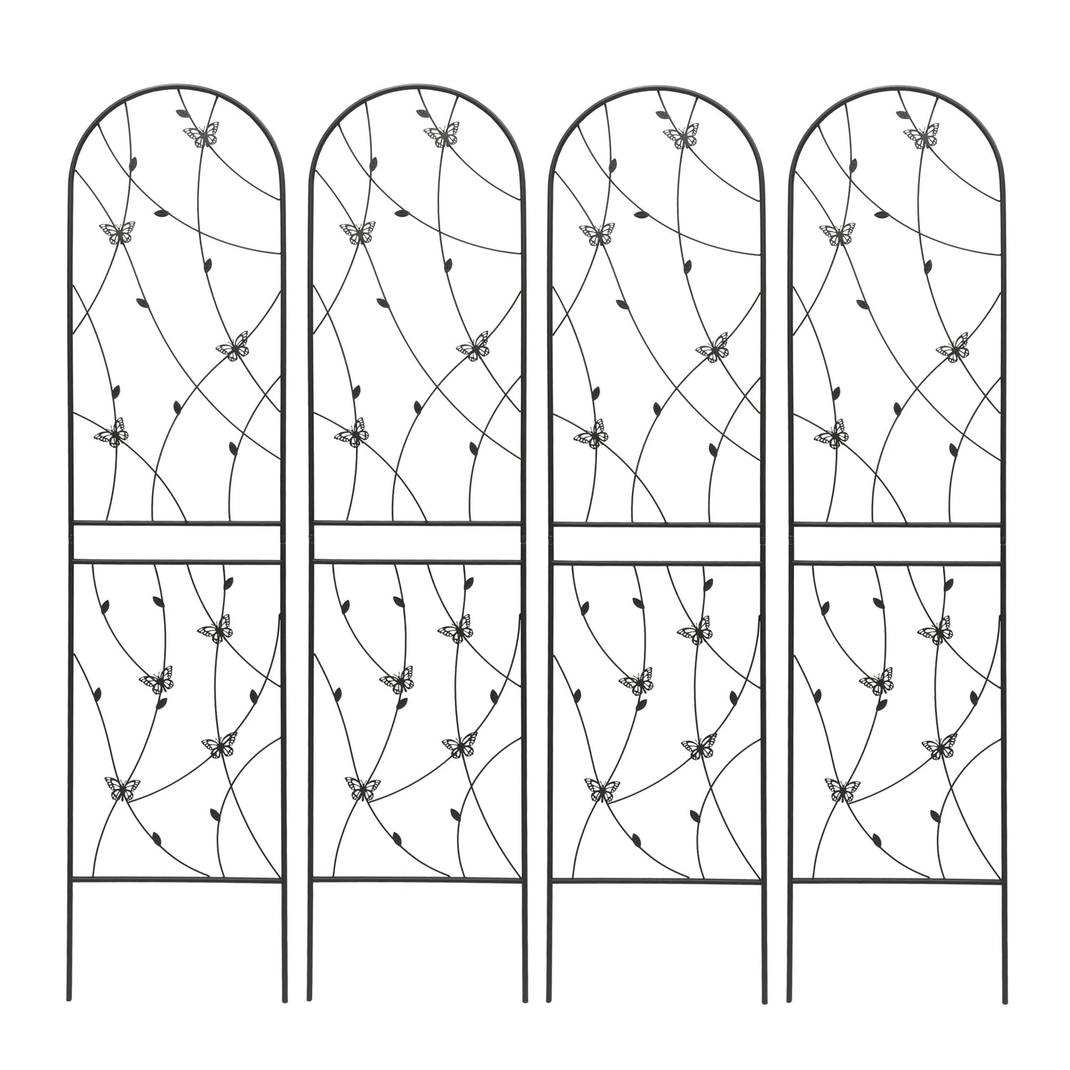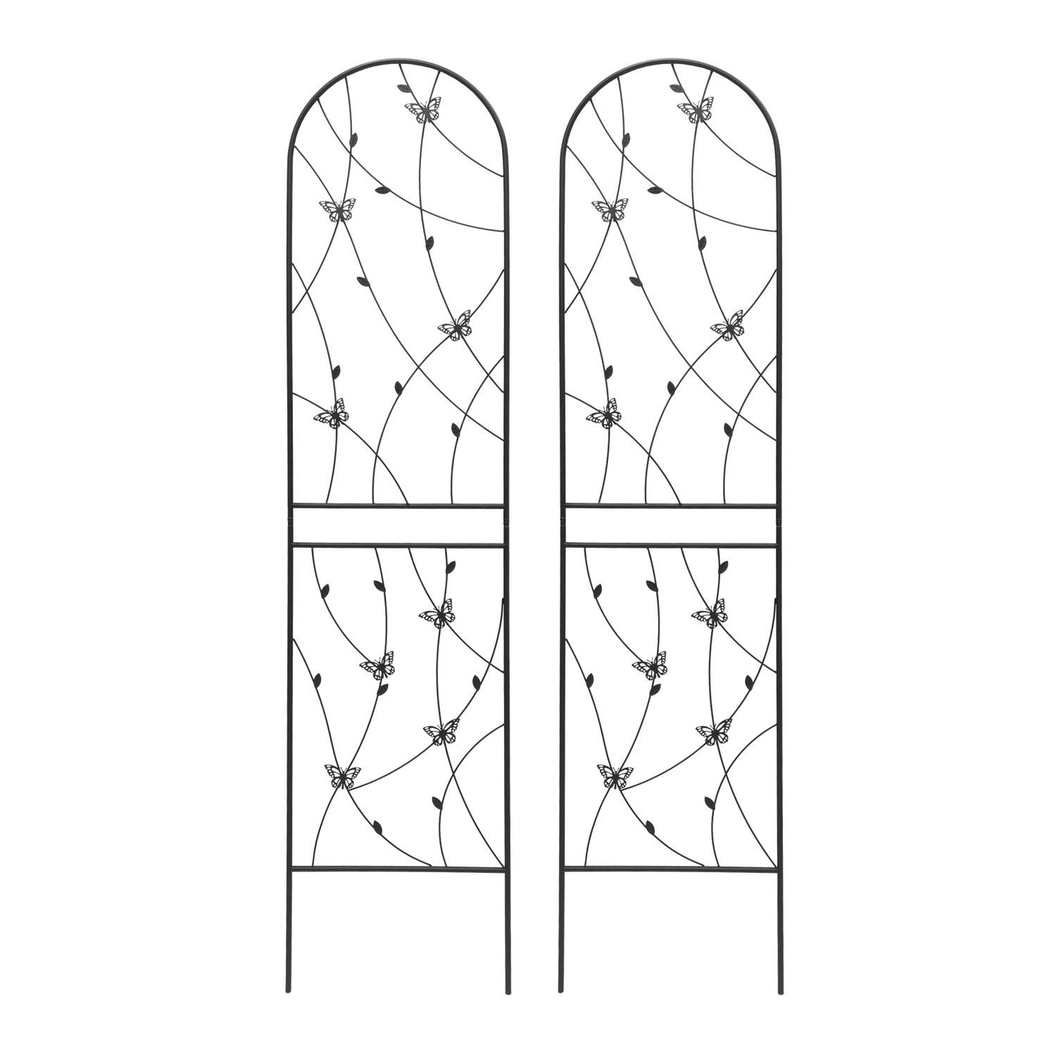 Support your climbing plants effortlessly with this 2-pack set of metal garden trellises, each measuring 19.7 inches wide by 86.7 inches high. Crafted from sturdy iron with a powder-coated finish, these black trellises resist rust and weather damage for lasting outdoor use. Their elegant butterfly design adds a decorative touch while providing reliable support for vines, flowers, and vegetables like peas, cucumbers, and beans. Easy to assemble with pre-cut and pre-drilled holes, each trellis can stand alone or combine to form a natural garden screen or corner. Perfect for creating vertical interest and boosting plant health, these rustproof garden supports will bring height and charm to your outdoor space. Elevate your garden’s beauty and productivity today.