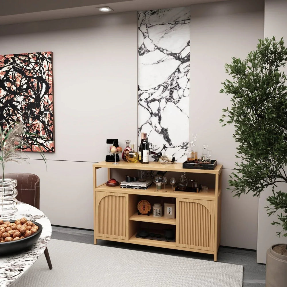 Omega Lifestyles bamboo sideboard features a natural finish with wide tabletop, dual magnetic-door cabinets, and multiple open and inner shelves, offering organized storage for bathroom toiletries, towels, and cosmetics while enhancing relaxation with its natural charm and compact design.
