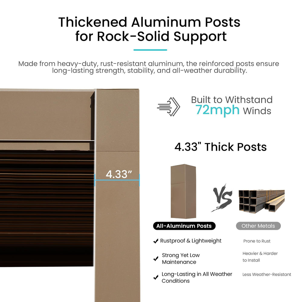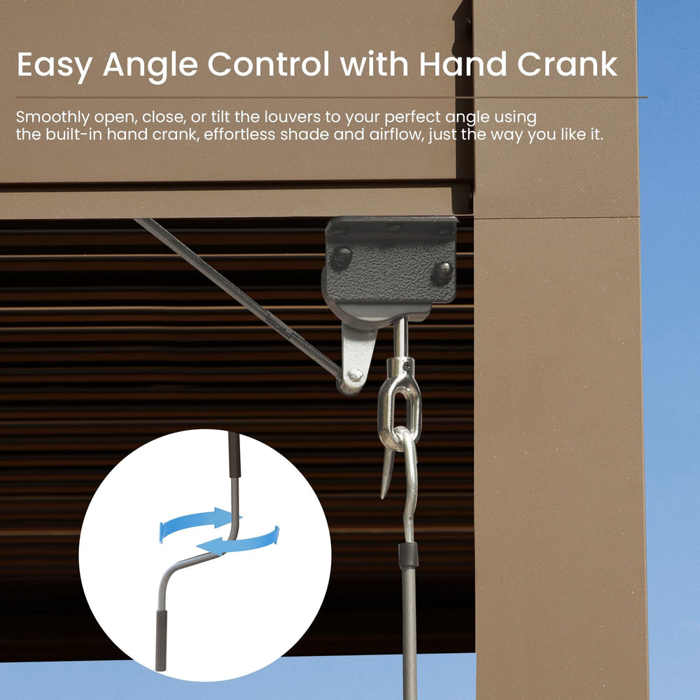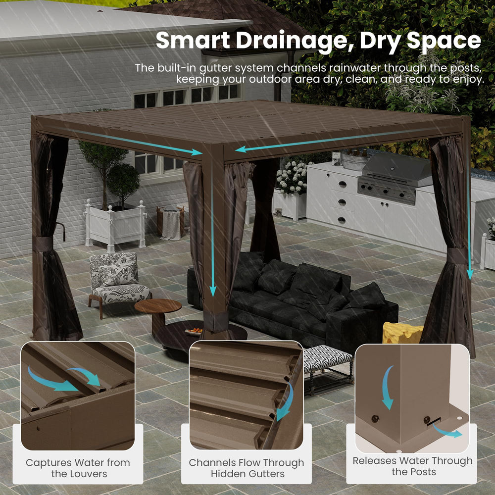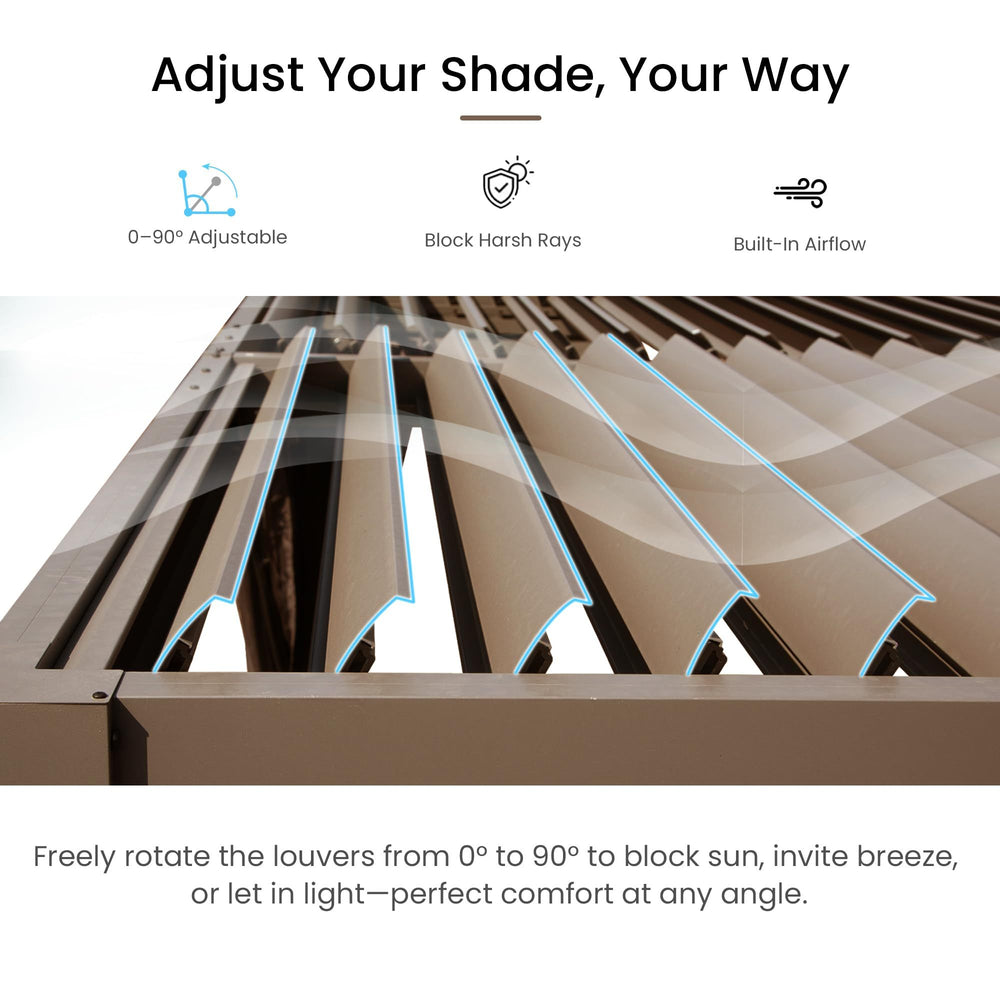 Experience versatile shade and weather protection with this stylish 10x10 foot outdoor louvered pergola. Crafted from premium rust-resistant aluminum, it offers durable all-weather performance, making it perfect for patios, decks, and gardens. The dual adjustable louver roof allows you to control sunlight and airflow effortlessly, tilting from fully closed to wide open. Integrated gutters channel rainwater away, keeping your outdoor space dry and comfortable. Its compact size fits smaller spaces while providing ample room for dining or lounging. Easy to install and secure with included hardware, this brown aluminum pergola combines function and modern design to elevate your outdoor gatherings year-round. Create your perfect outdoor haven and enjoy stylish shade and protection today.