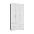 This white engineered wood wardrobe features three doors with sleek black metal handles, two bottom drawers, five shelves, and a hanging rail for versatile clothing and accessory storage. Easy to assemble and space-efficient, it suits bedroom or closet organization.