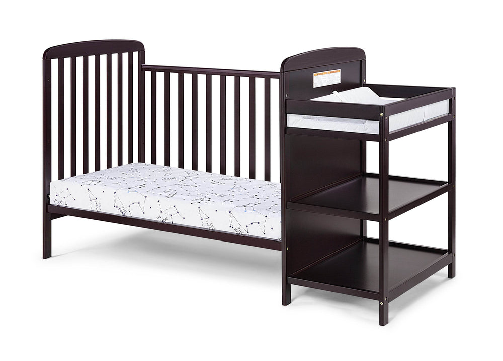 The Ramsey 3-in-1 convertible crib features solid wood construction in espresso finish, an attached changing table with ample storage, and converts to a toddler or day bed, maximizing nursery space and convenience for growing children.
