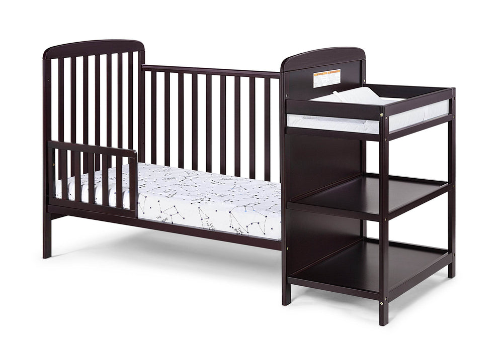 Designed to optimize space and convenience, the Ramsey 3-in-1 Convertible Crib and Changer Combo in rich espresso offers a smart solution for modern nurseries. Crafted from durable solid wood, this versatile crib features clean lines and a timeless finish that complements any decor. The attached changing table keeps baby essentials within easy reach while providing extra storage. As your child grows, transform the crib into a daybed or toddler bed with an optional guardrail, extending its use well beyond infancy. When the crib is no longer needed, the changing table detaches to become a standalone shelving unit, making this combo a functional and stylish investment for every stage of early childhood. Measuring 70.5 inches long by 30.5 inches wide and standing 41.75 inches high, it balances ample size with space-saving design. Elevate your nursery setup today with this elegant and practical convertible solution.