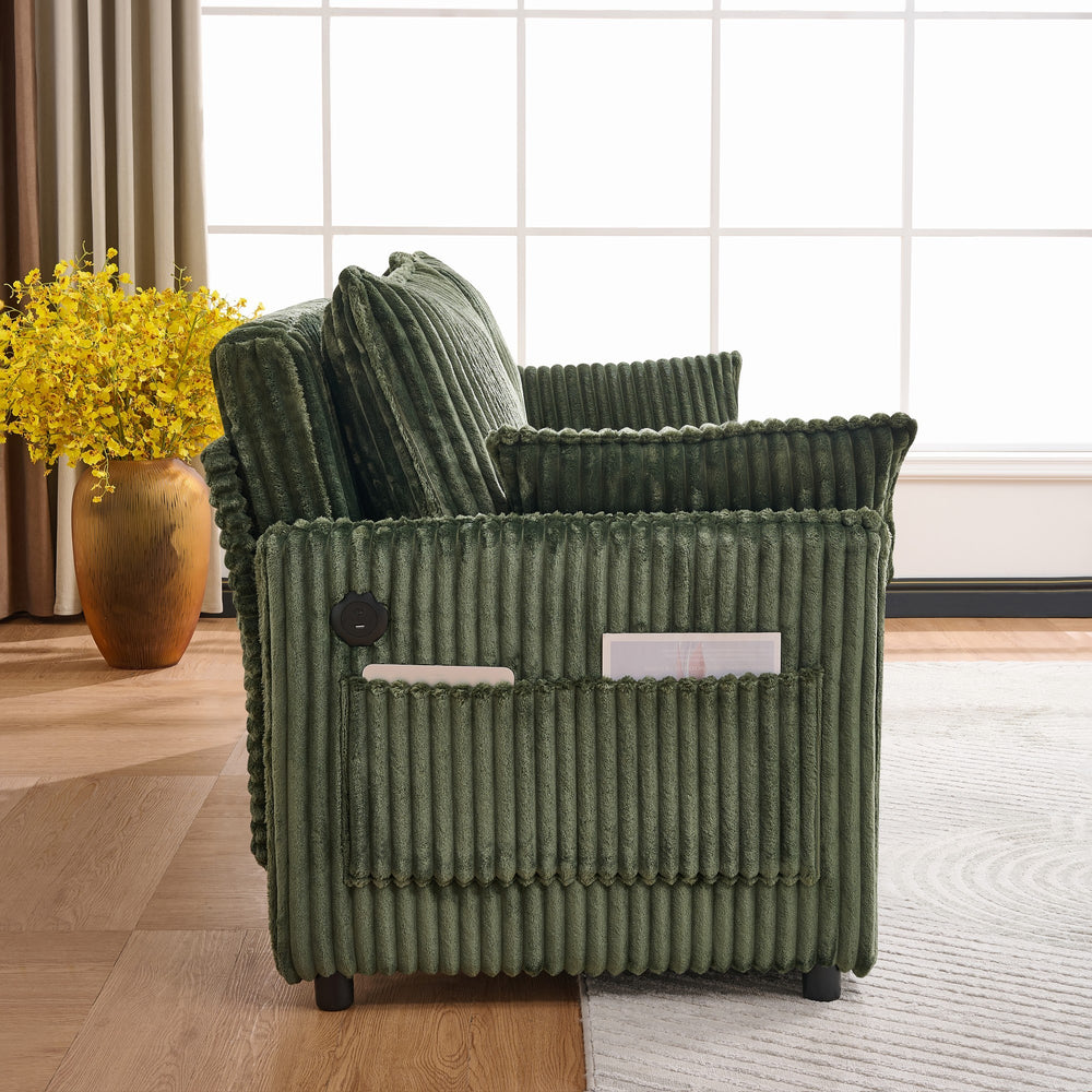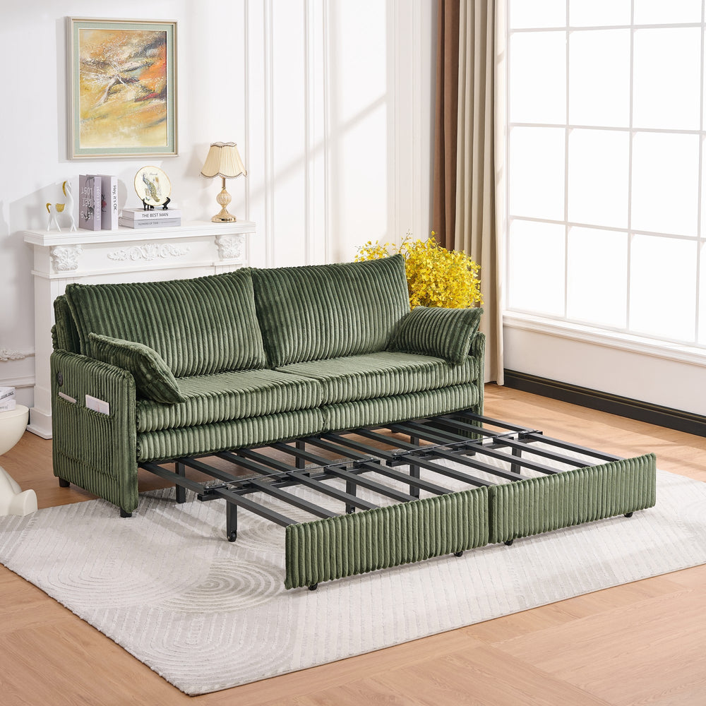 Perfect for small apartments and multifunctional bedrooms, this modern green corduroy sofa effortlessly transforms to accommodate your lifestyle. Crafted with soft polyester upholstery and supportive foam filler, it offers inviting seating by day and a spacious full-size bed by night without needing a mattress. The sturdy pine and iron frame supports up to 600 lbs, ensuring durable comfort for everyday use. Thoughtfully designed with integrated USB ports and side pockets, it keeps your devices charged and essentials within reach. At 73 inches long and 35 inches high, this space-saving sofa bed blends style and practicality to enhance any living area. Elevate your small space living today with this versatile and stylish convertible sofa.