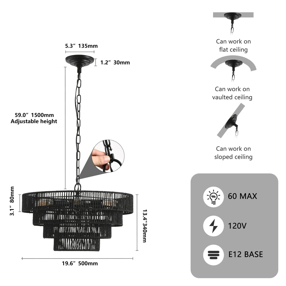 Enhance your living space with this handmade boho pendant light chandelier, designed to add warm, rustic charm and sophisticated style. Crafted from durable iron and natural hemp rope, its four-tier layered design creates a unique textured lampshade that diffuses light softly across your dining room, kitchen, or foyer. Featuring six E12 sockets, this ceiling fixture delivers ample illumination, adaptable as a main or accent light. The black industrial frame blends perfectly with the hemp rope for a modern-meets-retro aesthetic, ideal for farmhouse, industrial, or vintage-inspired interiors. With adjustable height up to 59 inches (150 cm), installation is simple and customizable to your space. Illuminate your home with artistic flair and functional lighting—upgrade your décor today.