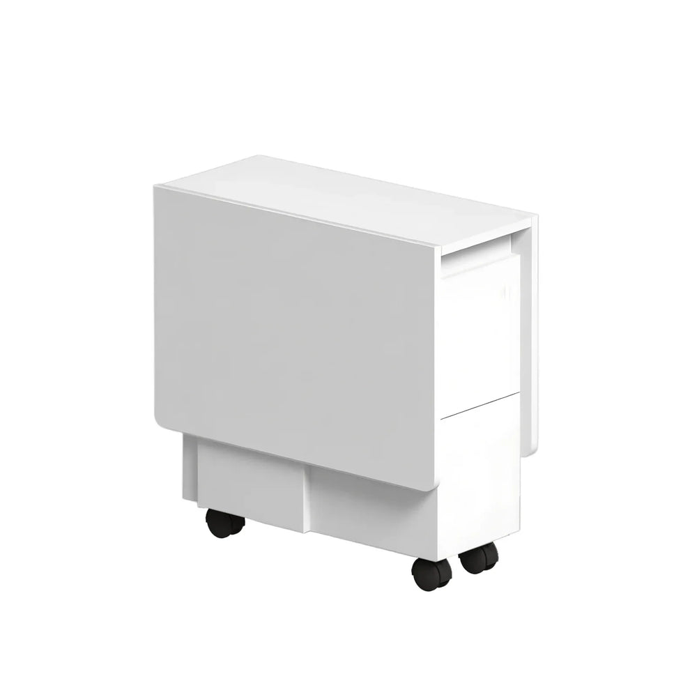 Experience versatile dining and workspace solutions with this folding drop leaf dining table set. Crafted from durable MDF and finished in a sleek white, this set includes four sturdy chairs supporting up to 200 pounds each. The table folds easily to transform from a spacious dining area for 4–6 people to a compact decorative cabinet, perfect for small living spaces. Equipped with six smooth-rolling wheels, it allows effortless mobility to suit your dynamic lifestyle. The waterproof and rustproof coated surface enhances longevity while making cleaning quick and hassle-free. Whether hosting family dinners, working from home, or enjoying afternoon tea, this set adapts seamlessly to your needs. Elevate your space efficiency and comfort—upgrade your home dining experience today.