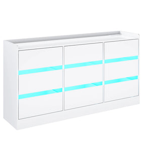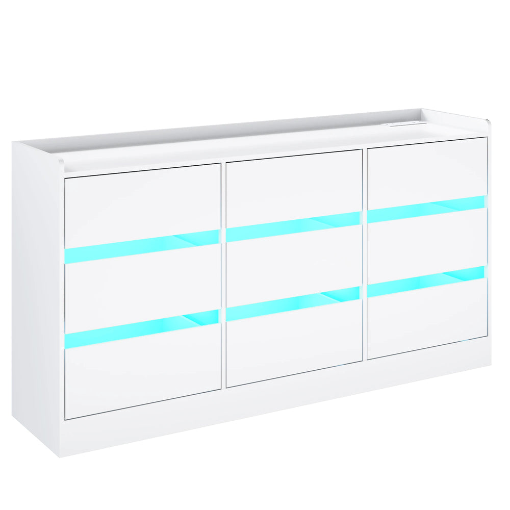 Organize your living space effortlessly with this sleek and minimalist 9 drawer dresser. Crafted from durable wood, it offers ample storage with smooth-glide drawers ideal for clothes, accessories, or everyday essentials. The clean, handle-free design brings a spacious, modern look that suits any contemporary decor. Enhance your bedroom ambiance with built-in RGB LED lights offering 60,000 color options and customizable modes controlled via remote or smartphone app. Conveniently charge your devices anytime using the integrated power outlets and USB ports on the tabletop, keeping your gadgets powered and within reach. Easy to assemble with clear instructions, this versatile dresser also fits perfectly in living rooms, entryways, or offices, making it a functional and stylish storage solution. Elevate your home organization and ambiance today.
